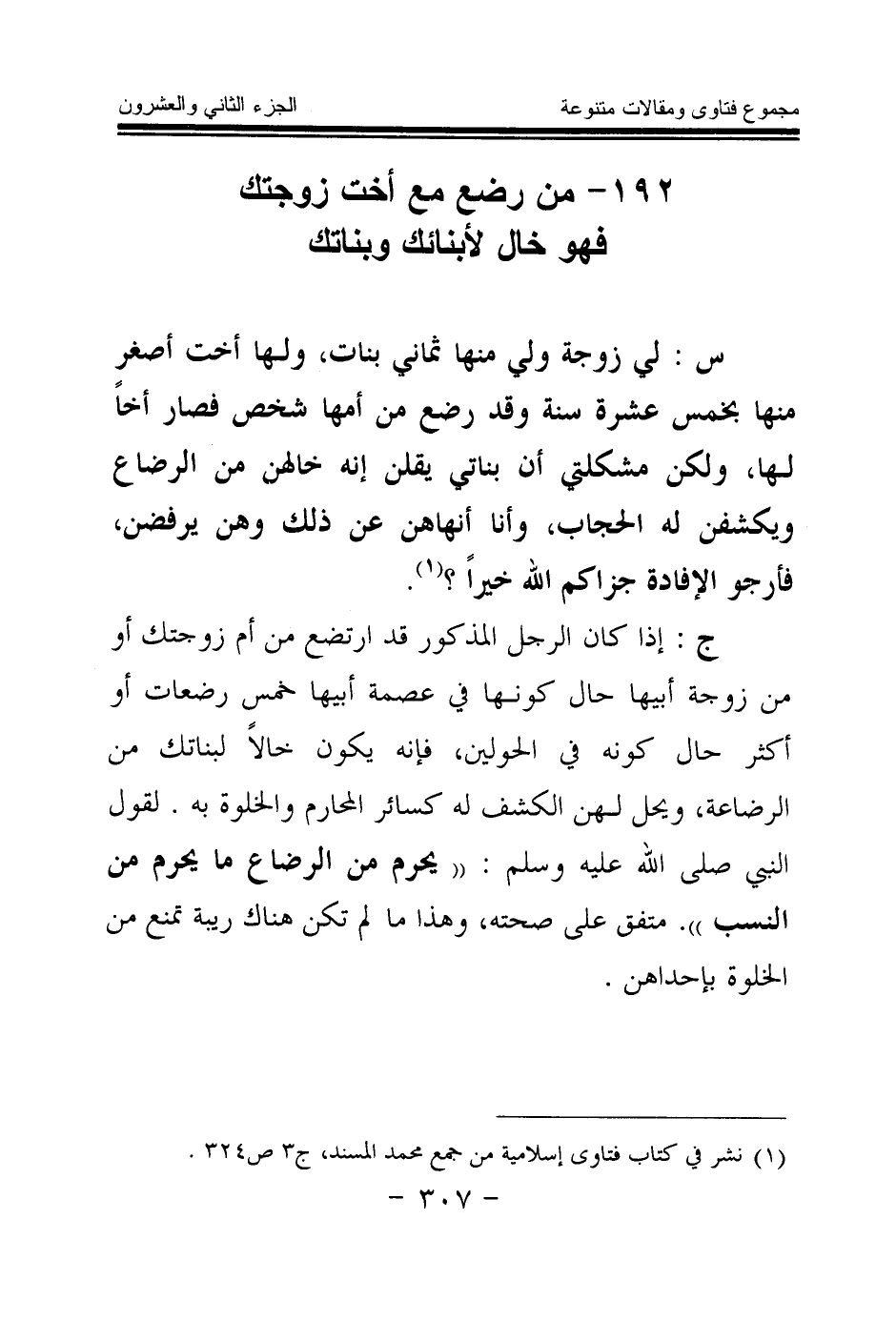 (¬1) نشر في كتاب فتاوى إسلامية من جمع محمد المسند، ج 3 ص 324.