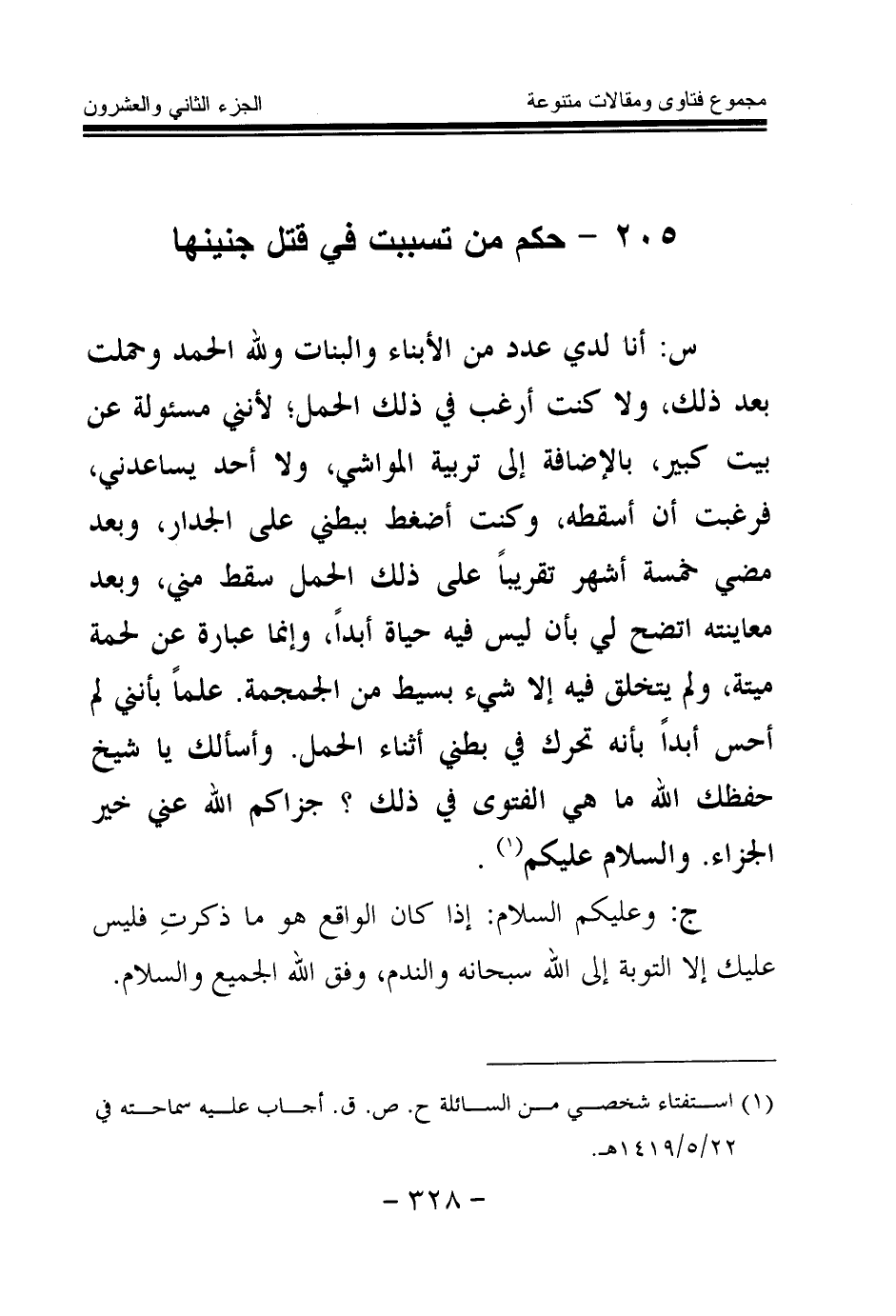 س: أنا لدي عدد من الأبناء والبنات ولله الحمد وحملت بعد ذلك، ولا كنت أرغب في ذلك الحمل؛ لأنني مسئولة عن بيت كبير، بالإضافة إلى تربية المواشي، ولا أحد يساعدني، فرغبت أن أسقطه، وكنت أضغط ببطني على الجدار، وبعد مضي خمسة أشهر تقريبا على ذلك الحمل سقط مني، وبعد معاينته اتضح لي بأن ليس فيه حياة أبدا، وإنما عبارة عن لحمة ميتة، ولم يتخلق فيه إلا شيء بسيط من الجمجمة. علما بأنني لم أحس أبدا بأنه تحرك في بطني أثناء الحمل. وأسألك يا شيخ حفظك الله ما هي الفتوى في ذلك؟ جزاكم الله عني خير الجزاء. والسلام عليكم (¬1) .
