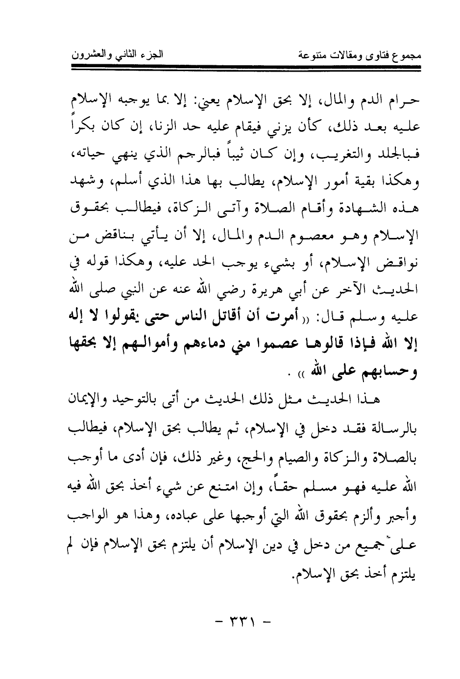 حرام الدم والمال، إلا بحق الإسلام يعني: إلا بما يوجبه الإسلام عليه بعد ذلك، كأن يزني فيقام عليه حد الزنا، إن كان بكرا فبالجلد والتغريب، وإن كان ثيبا فبالرجم الذي ينهي حياته، وهكذا بقية أمور الإسلام، يطالب بها هذا الذي أسلم، وشهد هذه الشهادة وأقام الصلاة وآتى الزكاة، فيطالب بحقوق الإسلام وهو معصوم الدم والمال، إلا أن يأتي بناقض من نواقض الإسلام، أو بشيء يوجب الحد عليه، وهكذا قوله في الحديث الآخر عن أبي هريرة - رضي الله عنه - عن النبي - صلى الله عليه وسلم - قال: «أمرت أن أقاتل الناس حتى يقولوا لا إله إلا الله فإذا قالوها عصموا مني دماءهم وأموالهم إلا بحقها وحسابهم على الله (¬1) » .