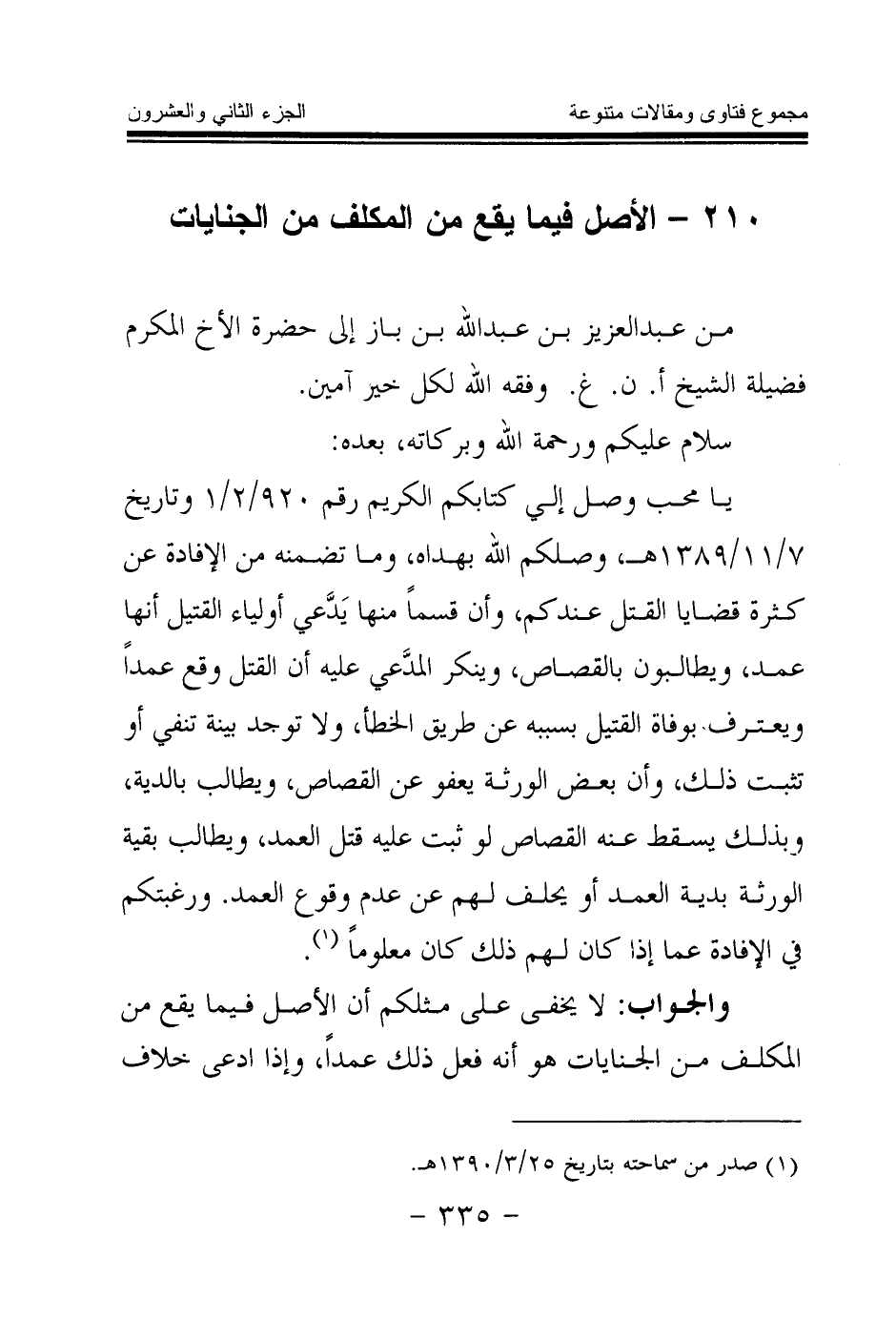 يا محب وصل إلي كتابكم الكريم رقم 920 \ 2 \ 1 وتاريخ 7 \ 11 \ 1389هـ وصلكم الله بهداه، وما تضمنه من الإفادة عن كثرة قضايا القتل عندكم، وأن قسما منها يدعي أولياء القتيل أنها عمد، ويطالبون بالقصاص، وينكر المدعي عليه أن القتل وقع عمدا، ويعترف بوفاة القتيل بسببه عن طريق الخطأ، ولا توجد بينة تنفي أو تثبت ذلك، وأن بعض الورثة يعفو عن القصاص، ويطالب بالدية، بذلك يسقط عنه القصاص لو ثبت عليه قتل العمد، ويطالب بقية الورثة بدية العمد أو يحلف لهم عن عدم وقوع العمد، ورغبتكم في الإفادة عما إذا كان لهم ذلك كان معلوما (¬1) .