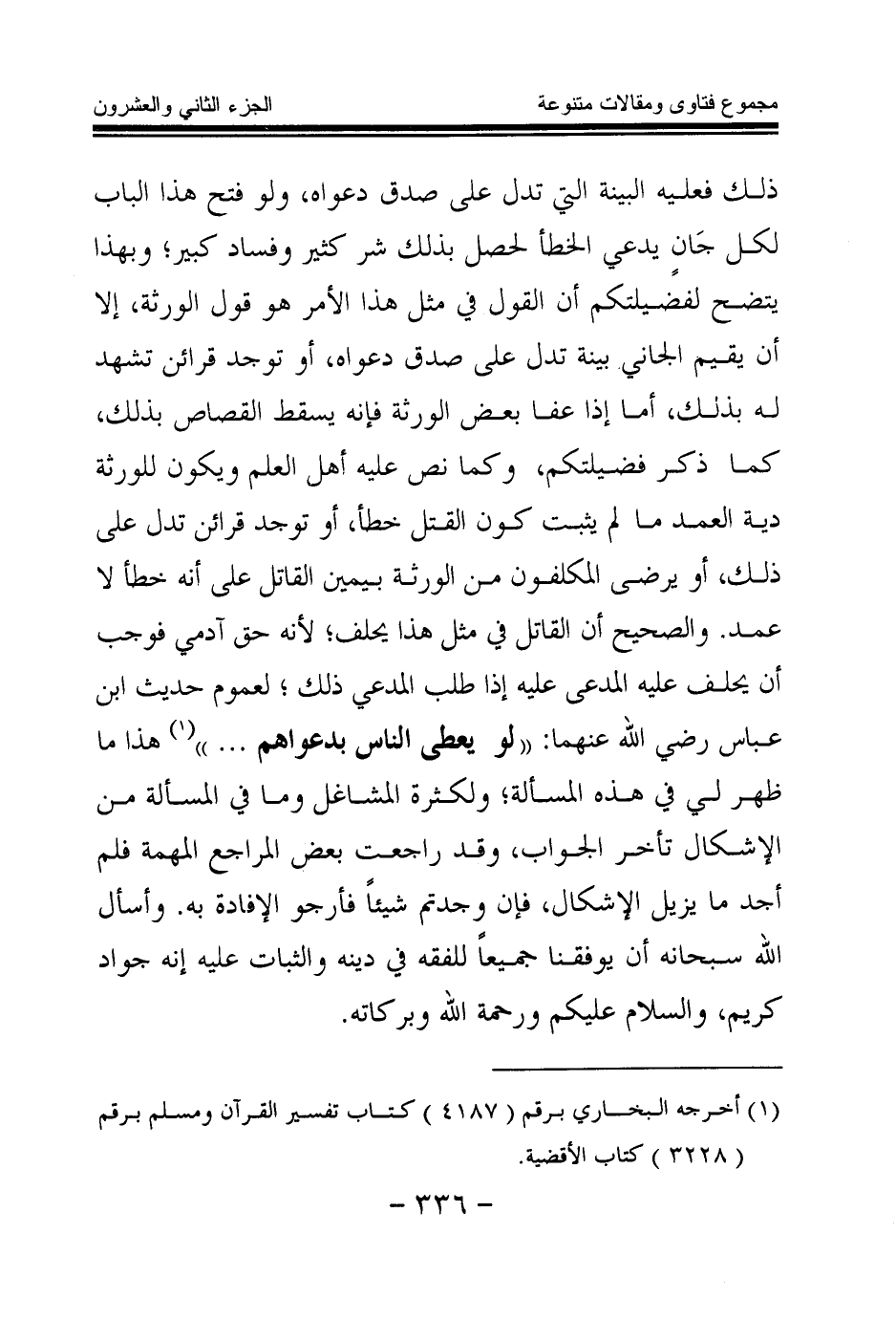 ذلك فعليه البينة التي تدل على صدق دعواه، ولو فتح هذا الباب لكل جان يدعي الخطأ لحصل بذلك شر كثير وفساد كبير؛ وبهذا يتضح لفضيلتكم أن القول في مثل هذا الأمر هو قول الورثة، إلا أن يقيم الجاني بينة تدل على صدق دعواه، أو توجد قرائن تشهد له بذلك، أما إذا عفا بعض الورثة، فإنه يسقط القصاص بذلك، كما ذكر فضيلتكم، وكما نص عليه أهل العلم، ويكون للورثة دية العمد ما لم يثبت كون القتل خطأ، أو توجد قرائن تدل على ذلك، أو يرضى المكلفون من الورثة بيمين القاتل على أنه خطأ لا عمد، والصحيح أن القاتل في مثل هذا يحلف؛ لأنه حق آدمي فوجب أن يحلف عليه المدعى عليه إذا طلب المدعي ذلك، لعموم حديث ابن عباس رضي الله عنهما: «لو يعطى الناس بدعواهم (¬1) » . . .، هذا ما ظهر لي في هذه المسألة ولكثرة المشاغل، وما في المسألة من الإشكال تأخر الجواب، وقد راجعت بعض المراجع المهمة فلم أجد ما يزيل الإشكال، فإن وجدتم شيئا فأرجو الإفادة به، وأسأل الله سبحانه أن يوفقنا جميعا للفقه في دينه والثبات عليه إنه جواد كريم، والسلام عليكم ورحمة الله وبركاته.