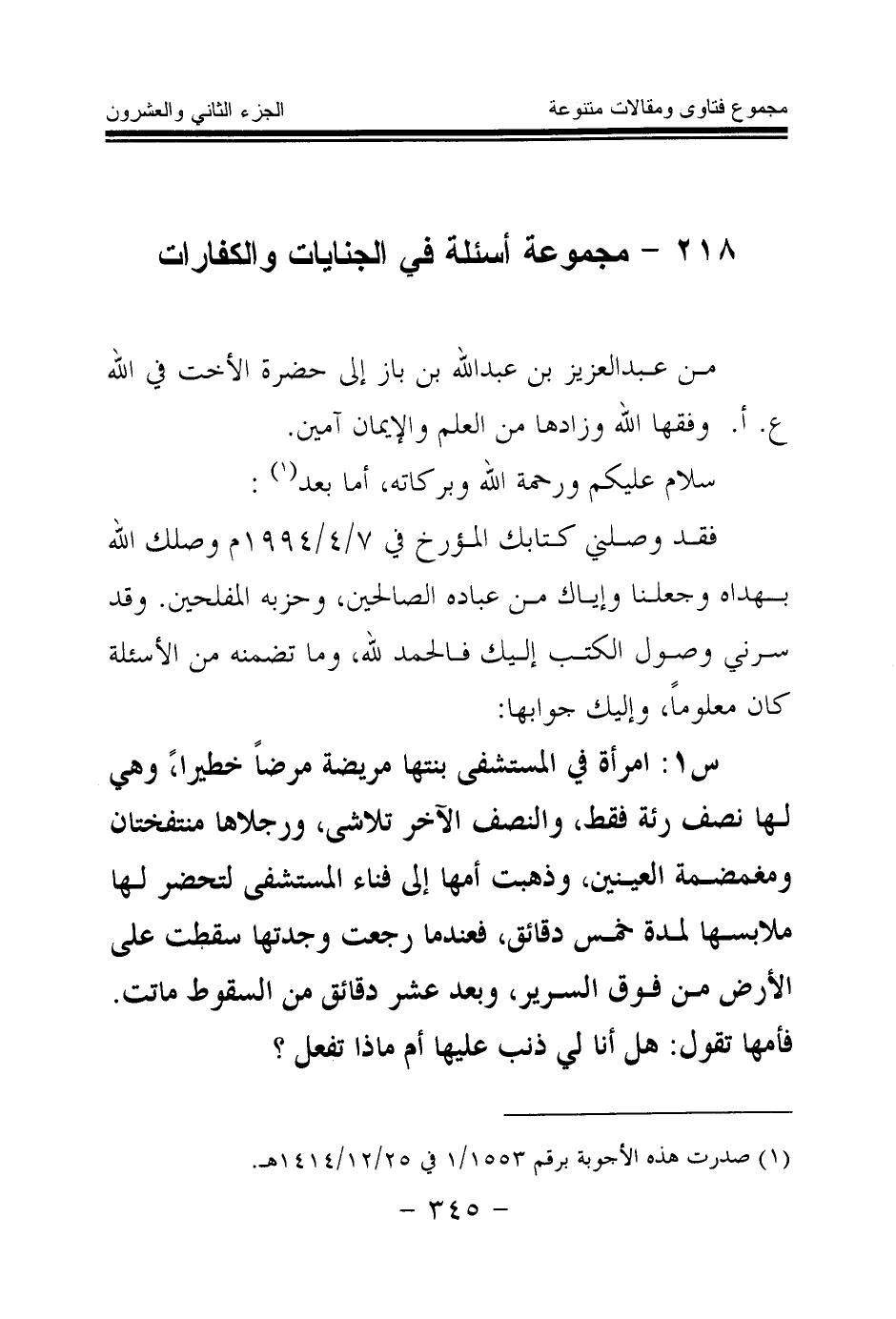 س1: امرأة في المستشفى بنتها مريضة مرضا خطيرا، وهي لها نصف رئة فقط، والنصف الآخر تلاشى، ورجلاها منتفختان ومغمضة العينين، وذهبت أمها إلى فناء المستشفى لتحضر لها ملابسها لمدة خمس دقائق، فعندما رجعت وجدتها سقطت على الأرض من فوق السرير، وبعد عشر دقائق من السقوط ماتت. فأمها تقول: هل أنا لي ذنب عليها أم ماذا تفعل؟
