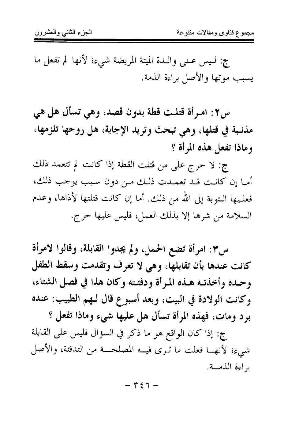 س2: امرأة قتلت قطة بدون قصد، وهي تسأل هل هي مذنبة في قتلها، وهي تبحث وتريد الإجابة، هل روحها تلزمها، وماذا تفعل هذه المرأة؟