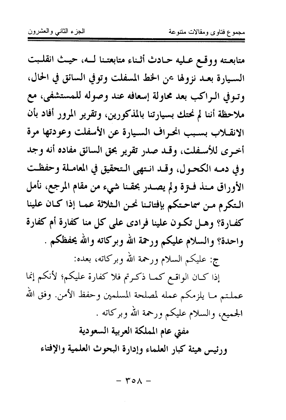 متابعته ووقع عليه حادث أثناء متابعتنا له، حيث انقلبت السيارة بعد نزولها عن الخط المسفلت، وتوفي السائق في الحال، وتوفي الراكب بعد محاولة إسعافه عند وصوله للمستشفى، مع ملاحظة أننا لم نحتك بسيارتنا بالمذكورين، وتقرير المرور أفاد بأن الانقلاب بسبب انحراف السيارة عن الأسفلت وعودتها مرة أخرى للأسفلت، وقد صدر تقرير بحق السائق مفاده: أنه وجد وفي دمه الكحول، وقد انتهى التحقيق في المعاملة وحفظت الأوراق منذ فترة ولم يصدر بحقنا شيء من مقام المرجع، نأمل التكرم من سماحتكم بإفتائنا نحن الثلاثة عما إذا كان علينا كفارة؟ وهل تكون علينا فرادى على كل منا كفارة أم كفارة واحدة؟ والسلام عليكم ورحمة الله وبركاته والله يحفظكم.