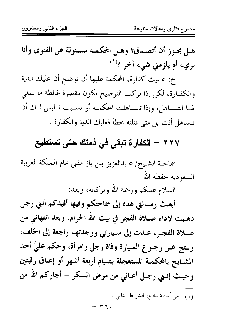 أبعث رسالتي هذه إلى سماحتكم وفيها أفيدكم أنني رجل ذهبت لأداء صلاة الفجر في بيت الله الحرام، وبعد انتهائي من صلاة الفجر، عدت إلى سيارتي ووجدتها راجعة إلى الخلف، ونتج عن رجوع السيارة وفاة رجل وامرأة، وحكم علي أحد المشايخ بالمحكمة المستعجلة بصيام أربعة أشهر أو إعتاق رقبتين وحيث إنني رجل أعاني من مرض السكر- أجاركم الله من