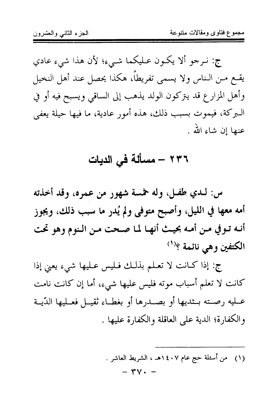 ج: نرجو ألا يكون عليكما شيء؛ لأن هذا شيء عادي يقع من الناس ولا يسمى تفريطا، هكذا يحصل عند أهل النخيل وأهل المزارع قد يتركون الولد يذهب إلى الساقي ويسبح فيه أو في البركة، فيموت بسبب ذلك، هذه أمور عادية، ما فيها حيلة يعفى عنها إن شاء الله.
