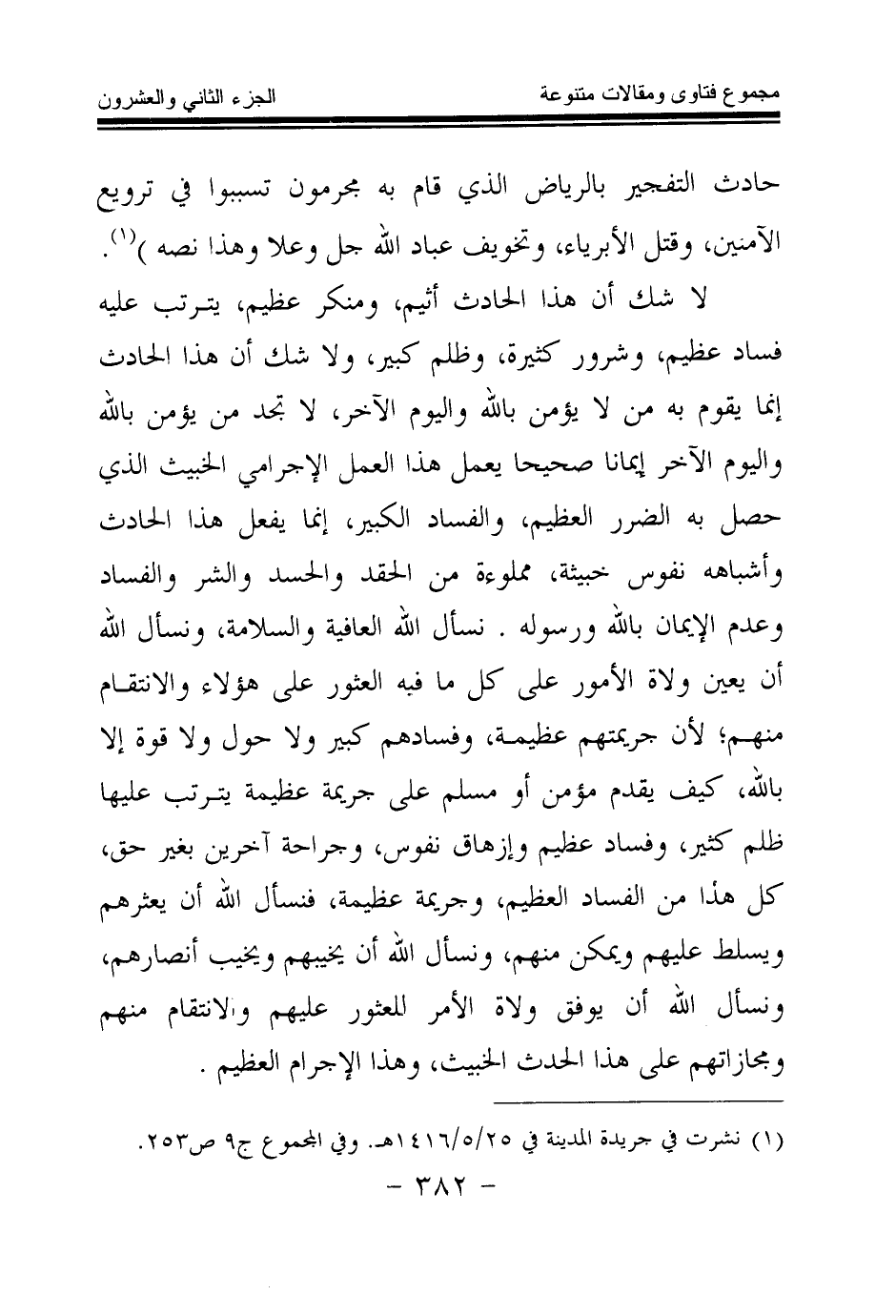 حادث التفجير بالرياض الذي قام به مجرمون تسببوا في ترويع الآمنين، وقتل الأبرياء، وتخويف عباد الله جل وعلا وهذا نصه) (¬1)