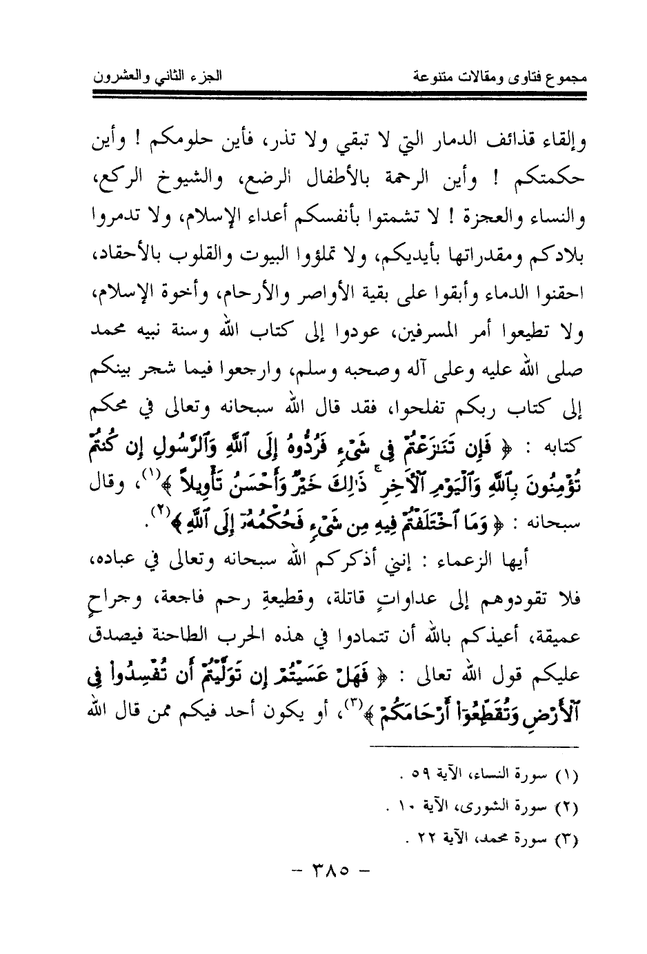 وإلقاء قذائف الدمار التي لا تبقي ولا تذر، فأين حلومكم! وأين حكمتكم! وأين الرحمة بالأطفال الرضع، والشيوخ الركع، والنساء والعجزة! لا تشمتوا بأنفسكم أعداء الإسلام، ولا تدمروا بلادكم ومقدراتها بأيديكم، ولا تملؤوا البيوت والقلوب بالأحقاد، احقنوا الدماء وأبقوا على بقية الأواصر والأرحام وأخوة الإسلام، ولا تطيعوا أمر المسرفين، عودوا إلى كتاب الله وسنة نبيه محمد صلى الله عليه وعلى آله وصحبه وسلم، وارجعوا فيما شجر بينكم إلى كتاب ربكم تفلحوا، فقد قال الله سبحانه وتعالى في محكم كتابه: {فَإِنْ تَنَازَعْتُمْ فِي شَيْءٍ فَرُدُّوهُ إِلَى اللَّهِ وَالرَّسُولِ إِنْ كُنْتُمْ تُؤْمِنُونَ بِاللَّهِ وَالْيَوْمِ الْآخِرِ ذَلِكَ خَيْرٌ وَأَحْسَنُ تَأْوِيلًا} (¬1) وقال سبحانه: {وَمَا اخْتَلَفْتُمْ فِيهِ مِنْ شَيْءٍ فَحُكْمُهُ إِلَى اللَّهِ} (¬2)