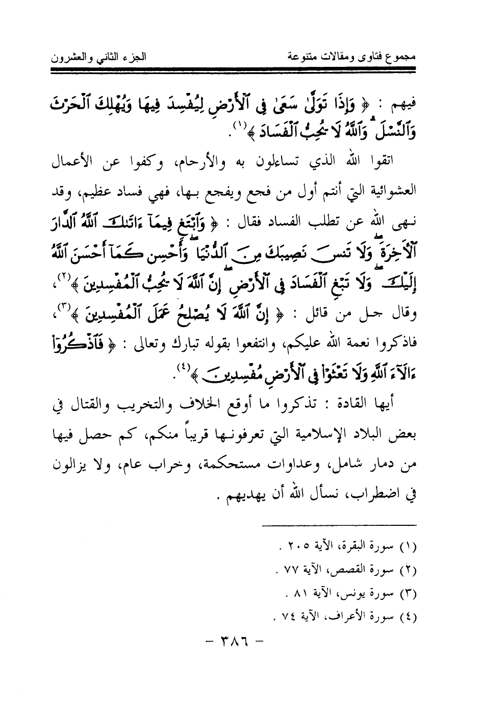 اتقوا الله الذي تساءلون به والأرحام، وكفوا عن الأعمال العشوائية التي أنتم أول من فجع ويفجع بها، فهي فساد عظيم، وقد نهى الله عن تطلب الفساد فقال: {وَابْتَغِ فِيمَا آتَاكَ اللَّهُ الدَّارَ الْآخِرَةَ وَلَا تَنْسَ نَصِيبَكَ مِنَ الدُّنْيَا وَأَحْسِنْ كَمَا أَحْسَنَ اللَّهُ إِلَيْكَ وَلَا تَبْغِ الْفَسَادَ فِي الْأَرْضِ إِنَّ اللَّهَ لَا يُحِبُّ الْمُفْسِدِينَ} (¬2) وقال جل من قائل: {إِنَّ اللَّهَ لَا يُصْلِحُ عَمَلَ الْمُفْسِدِينَ} (¬3) فاذكروا نعمة الله عليكم، وانتفعوا بقوله تبارك وتعالى: {فَاذْكُرُوا آلَاءَ اللَّهِ وَلَا تَعْثَوْا فِي الْأَرْضِ مُفْسِدِينَ} (¬4)