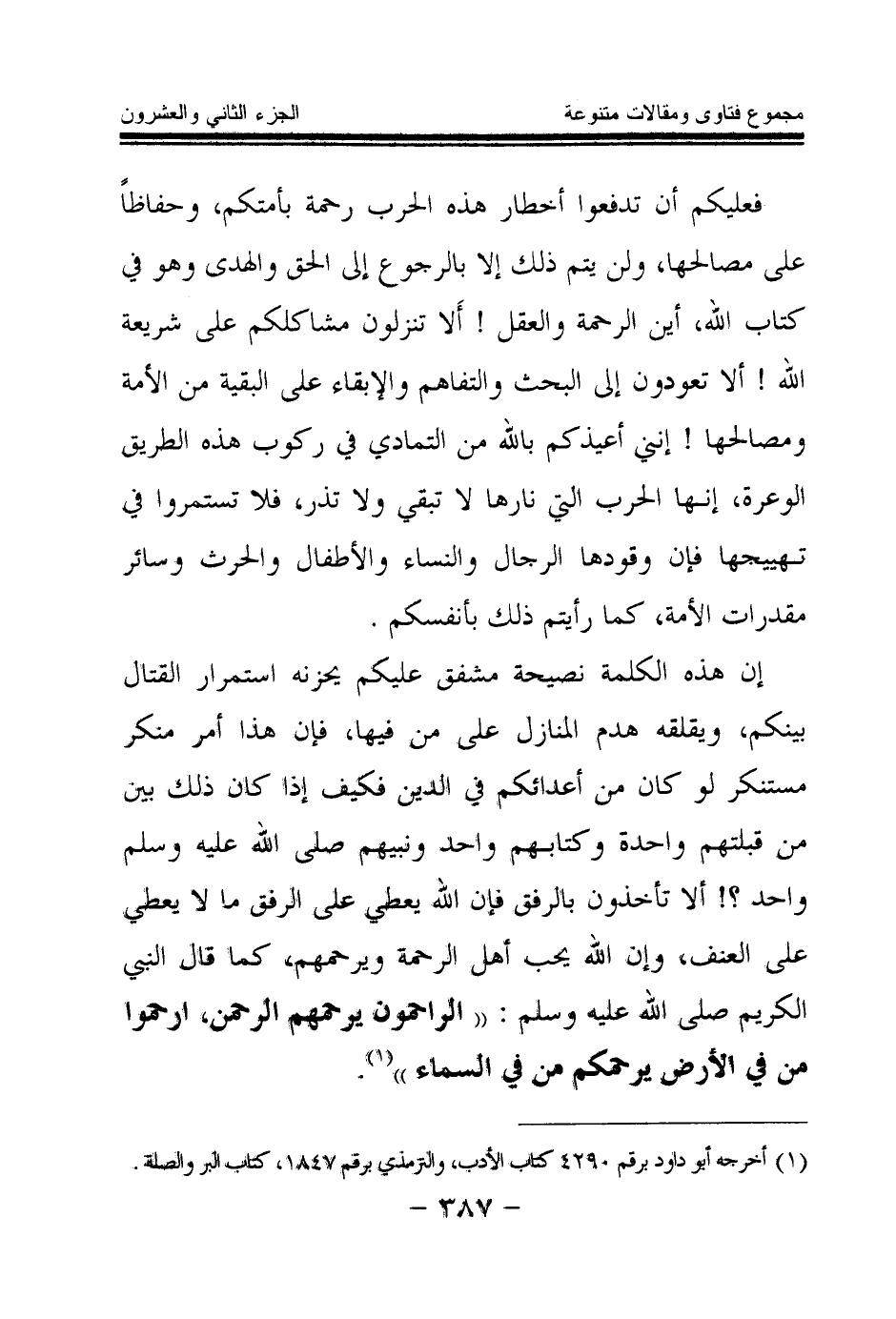 إن هذه الكلمة نصيحة مشفق عليكم يحزنه استمرار القتال بينكم، ويقلقه هدم المنازل على من فيها، فإن هذا أمر منكر مستنكر لو كان من أعدائكم في الدين، فكيف إذا كان ذلك بين من قبلتهم واحدة وكتابهم واحد ونبيهم صلى الله عليه وسلم واحد؟! ألا تأخذون بالرفق فإن الله يعطي على الرفق ما لا يعطي على العنف، وإن الله يحب أهل الرحمة ويرحمهم، كما قال النبي الكريم: «الراحمون يرحمهم الرحمن، ارحموا من في الأرض يرحمكم من في السماء (¬1) » .