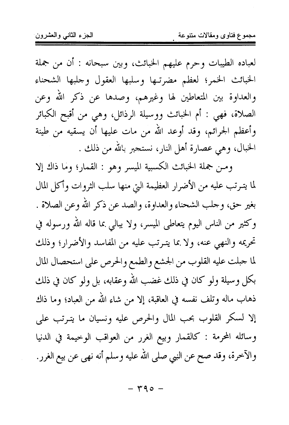 وكثير من الناس اليوم يتعاطى الميسر، ولا يبالي بما قاله الله ورسوله في تحريمه والنهي عنه، ولا بما يترتب عليه من المفاسد والأضرار؛ وذلك لما جبلت عليه القلوب من الجشع والطمع والحرص على استحصال المال بكل وسيلة، ولو كان في ذلك غضب الله وعقابه، بل ولو كان في ذلك ذهاب ماله وتلف نفسه في العاقبة، إلا من شاء الله من العباد، وما ذاك إلا لسكر القلوب بحب المال والحرص عليه ونسيان ما يترتب على وسائله المحرمة: كالقمار وبيع الغرر من العواقب الوخيمة في الدنيا والآخرة، وقد صح عن النبي صلى الله عليه وسلم «أنه نهى عن بيع الغرر (¬1) » .