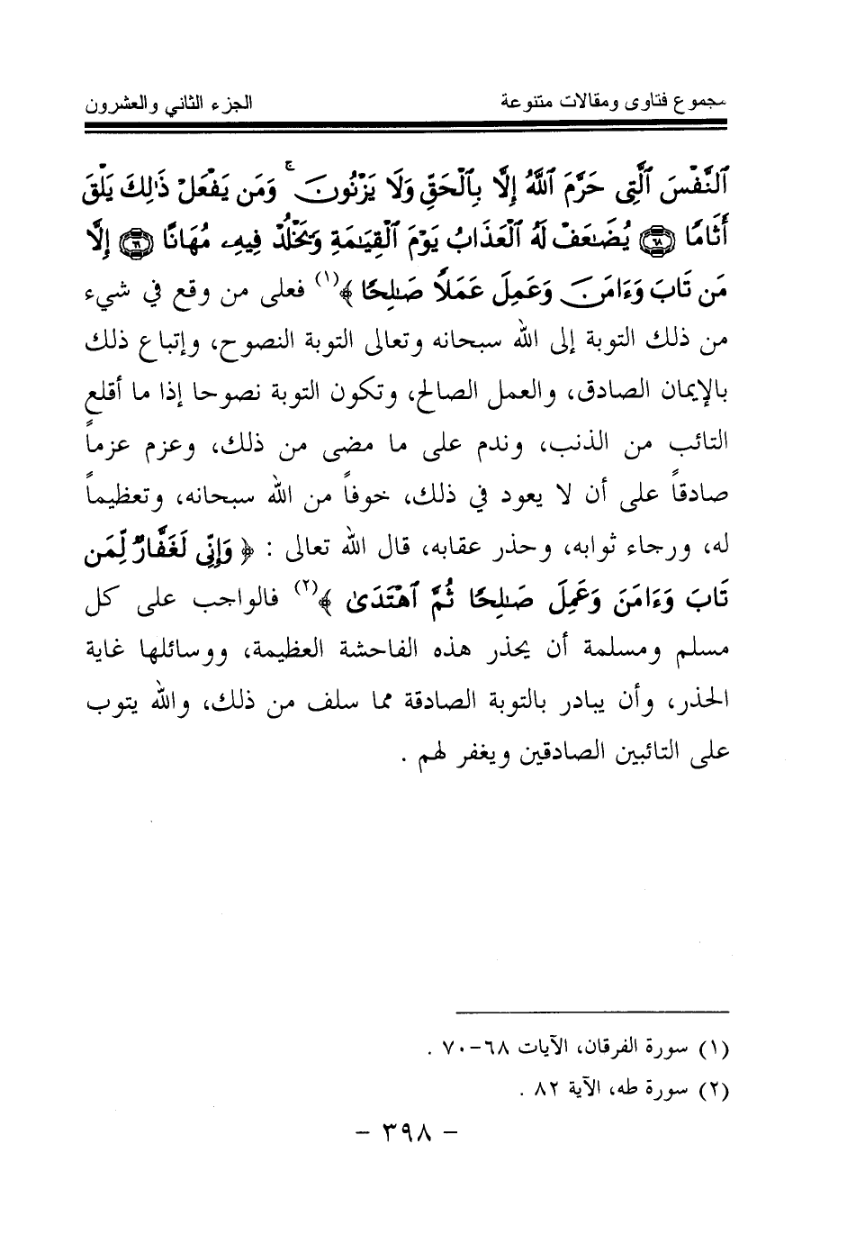 {وَالَّذِينَ لَا يَدْعُونَ مَعَ اللَّهِ إِلَهًا آخَرَ وَلَا يَقْتُلُونَ النَّفْسَ الَّتِي حَرَّمَ اللَّهُ إِلَّا بِالْحَقِّ وَلَا يَزْنُونَ وَمَنْ يَفْعَلْ ذَلِكَ يَلْقَ أَثَامًا} (¬1) {يُضَاعَفْ لَهُ الْعَذَابُ يَوْمَ الْقِيَامَةِ وَيَخْلُدْ فِيهِ مُهَانًا} (¬2) {إِلَّا مَنْ تَابَ وَآمَنَ وَعَمِلَ عَمَلًا صَالِحًا} (¬3) فعلى من وقع في شيء من ذلك التوبة إلى الله سبحانه وتعالى التوبة النصوح، وإتباع ذلك بالإيمان الصادق، والعمل الصالح، وتكون التوبة نصوحا إذا ما أقلع التائب من الذنب، وندم على ما مضى من ذلك، وعزم عزما صادقا على أن لا يعود في ذلك، خوفا من الله سبحانه، وتعظيما له، ورجاء ثوابه، وحذر عقابه، قال الله تعالى: {وَإِنِّي لَغَفَّارٌ لِمَنْ تَابَ وَآمَنَ وَعَمِلَ صَالِحًا ثُمَّ اهْتَدَى} (¬4) فالواجب على كل مسلم ومسلمة أن يحذر هذه الفاحشة العظيمة، ووسائلها غاية الحذر، وأن يبادر بالتوبة الصادقة مما سلف من ذلك، والله يتوب على التائبين الصادقين ويغفر لهم.