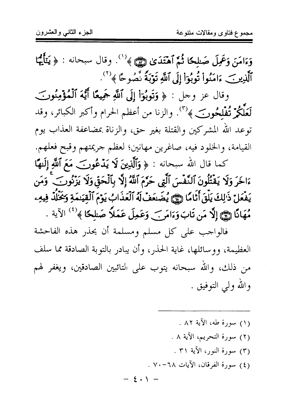 {وَإِنِّي لَغَفَّارٌ لِمَنْ تَابَ وَآمَنَ وَعَمِلَ صَالِحًا ثُمَّ اهْتَدَى} (¬1) وقال سبحانه: {يَا أَيُّهَا الَّذِينَ آمَنُوا تُوبُوا إِلَى اللَّهِ تَوْبَةً نَصُوحًا} (¬2) وقال عز وجل: {وَتُوبُوا إِلَى اللَّهِ جَمِيعًا أَيُّهَ الْمُؤْمِنُونَ لَعَلَّكُمْ تُفْلِحُونَ} (¬3) والزنا من أعظم الحرام وأكبر الكبائر، وقد توعد الله المشركين والقتلة بغير حق، والزناة بمضاعفة العذاب يوم القيامة، والخلود فيه، صاغرين مهانين، لعظم جريمتهم وقبح فعلهم، كما قال الله سبحانه: {وَالَّذِينَ لَا يَدْعُونَ مَعَ اللَّهِ إِلَهًا آخَرَ وَلَا يَقْتُلُونَ النَّفْسَ الَّتِي حَرَّمَ اللَّهُ إِلَّا بِالْحَقِّ وَلَا يَزْنُونَ وَمَنْ يَفْعَلْ ذَلِكَ يَلْقَ أَثَامًا} (¬4) {يُضَاعَفْ لَهُ الْعَذَابُ يَوْمَ الْقِيَامَةِ وَيَخْلُدْ فِيهِ مُهَانًا} (¬5) {إِلَّا مَنْ تَابَ وَآمَنَ وَعَمِلَ عَمَلًا صَالِحًا} (¬6) الآية.
