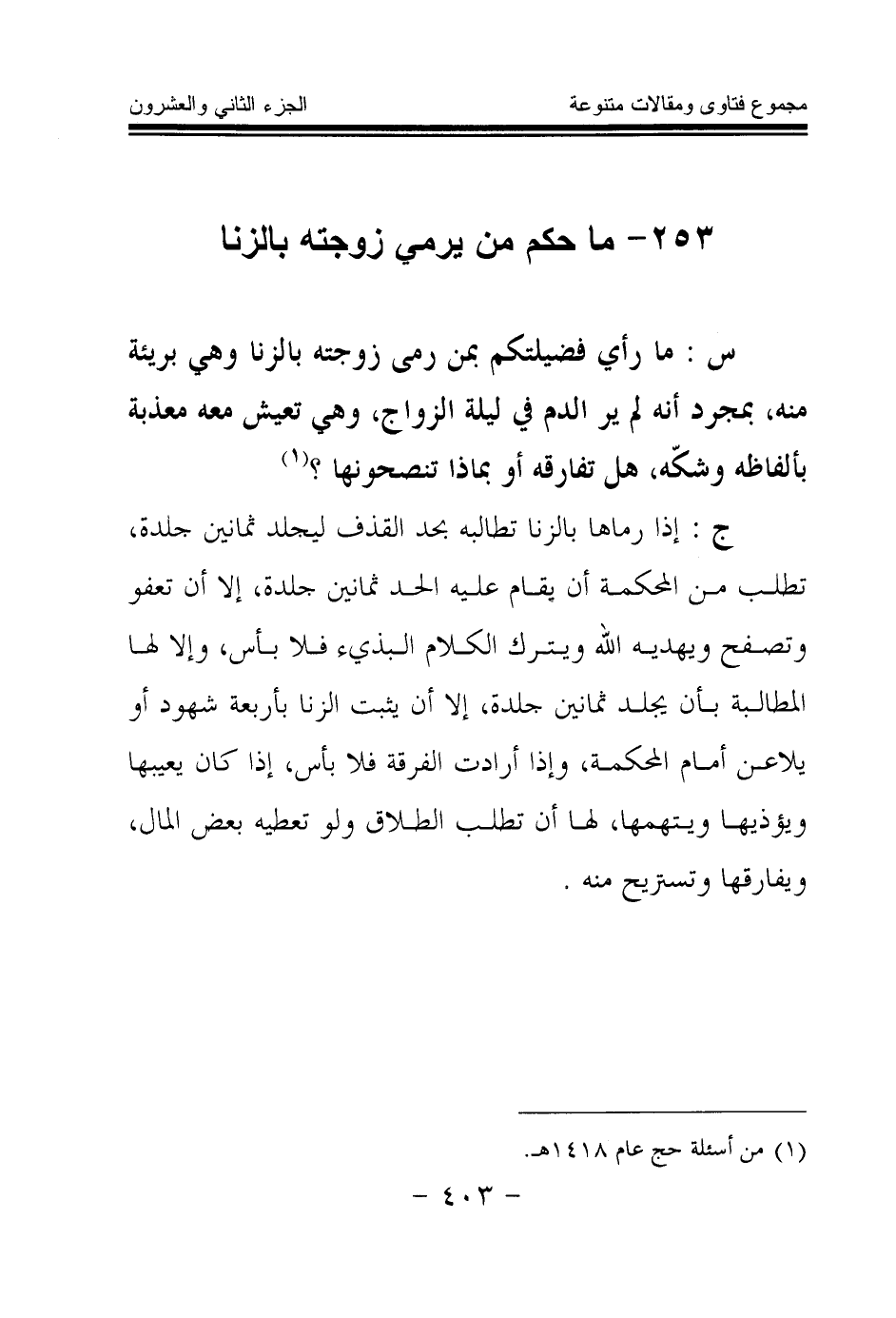 س: ما رأي فضيلتكم بمن رمى زوجته بالزنا وهي بريئة منه، بمجرد أنه لم ير الدم في ليلة الزواج، وهي تعيش معه معذبة بألفاظه وشكه، هل تفارقه أو بماذا تنصحونها؟ (¬1)
