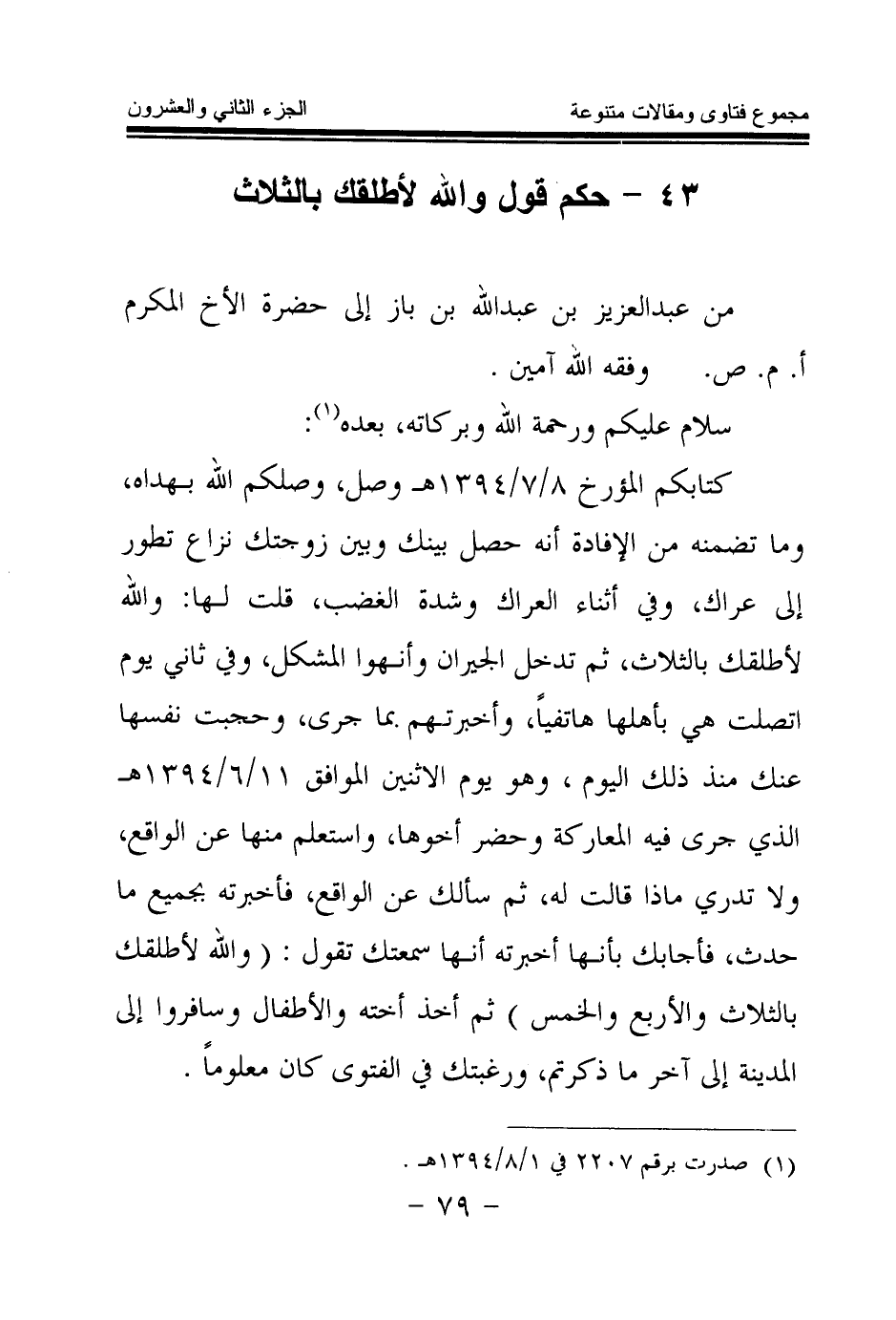 كتابكم المؤرخ 8 \ 7 \ 1394 هـ وصل، وصلكم الله بهداه، وما تضمنه من الإفادة أنه حصل بينك وبين زوجتك نزاع تطور إلى عراك، وفي أثناء العراك وشدة الغضب، قلت لها: والله لأطلقك بالثلاث، ثم تدخل الجيران وأنهوا المشكل، وفي ثاني يوم اتصلت هي بأهلها هاتفيا، وأخبرتهم بما جرى، وحجبت نفسها عنك منذ ذلك اليوم، وهو يوم الاثنين الموافق 11 \ 6 \ 1394هـ الذي جرى فيه المعاركة وحضر أخوها، واستعلم منها عن الواقع، ولا تدري ماذا قالت له، ثم سألك عن الواقع، فأخبرته بجميع ما حدث، فأجابك بأنها أخبرته أنها سمعتك تقول: (والله لأطلقك بالثلاث والأربع والخمس) ثم أخذ أخته والأطفال وسافروا إلى المدينة إلى آخر ما ذكرتم، ورغبتك في الفتوى كان معلوما.