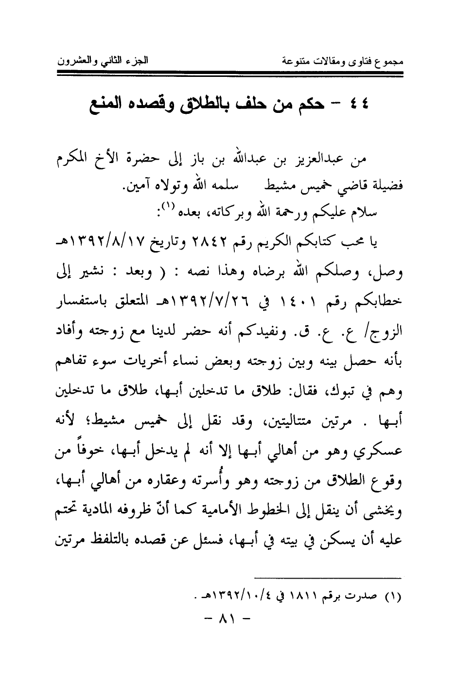 يا محب كتابكم الكريم رقم 2842 وتاريخ 17 \ 8 \ 1392هـ وصل، وصلكم الله برضاه وهذا نصه: (وبعد: نشير إلى خطابكم رقم 1401 في 26 \ 7 \ 1392هـ المتعلق باستفسار الزوج \ ع. ع. ق. ونفيدكم أنه حضر لدينا مع زوجته وأفاد بأنه حصل بينه وبين زوجته وبعض نساء أخريات سوء تفاهم وهم في تبوك، فقال: طلاق ما تدخلين أبها، طلاق ما تدخلين أبها. مرتين متتاليتين، وقد نقل إلى خميس مشيط؛ لأنه عسكري وهو من أهالي أبها إلا أنه لم يدخل أبها، خوفا من وقوع الطلاق من زوجته وهو وأسرته وعقاره من أهالي أبها، ويخشى أن ينقل إلى الخطوط الأمامية كما أن ظروفه المادية تحتم عليه أن يسكن في بيته في أبها، فسئل عن قصده بالتلفظ مرتين