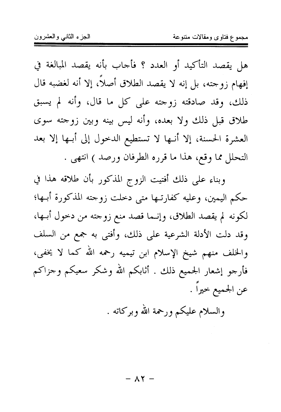 هل يقصد التأكيد أو العدد؟ فأجاب بأنه يقصد المبالغة في إفهام زوجته، بل إنه لا يقصد الطلاق أصلا، إلا أنه لغضبه قال ذلك، وقد صادقته زوجته على كل ما قال، وأنه لم يسبق طلاق قبل ذلك ولا بعده، وأنه ليس بينه وبين زوجته سوى العشرة الحسنة، إلا أنها لا تستطيع الدخول إلى أبها إلا بعد التحلل مما وقع، هذا ما قرره الطرفان ورصد) انتهى.