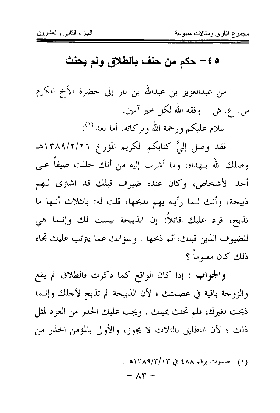 فقد وصل إلي كتابكم الكريم المؤرخ 26 \ 2 \ 1389هـ وصلك الله بهداه، وما أشرت إليه من أنك حللت ضيفا على أحد الأشخاص، وكان عنده ضيوف قبلك قد اشترى لهم ذبيحة، وأنك لما رأيته يهم بذبحها، قلت له: بالثلاث أنها ما تذبح، فرد عليك قائلا: إن الذبيحة ليست لك وإنما هي للضيوف الذين قبلك، ثم ذبحها. وسؤالك عما يترتب عليك تجاه ذلك كان معلوما؟