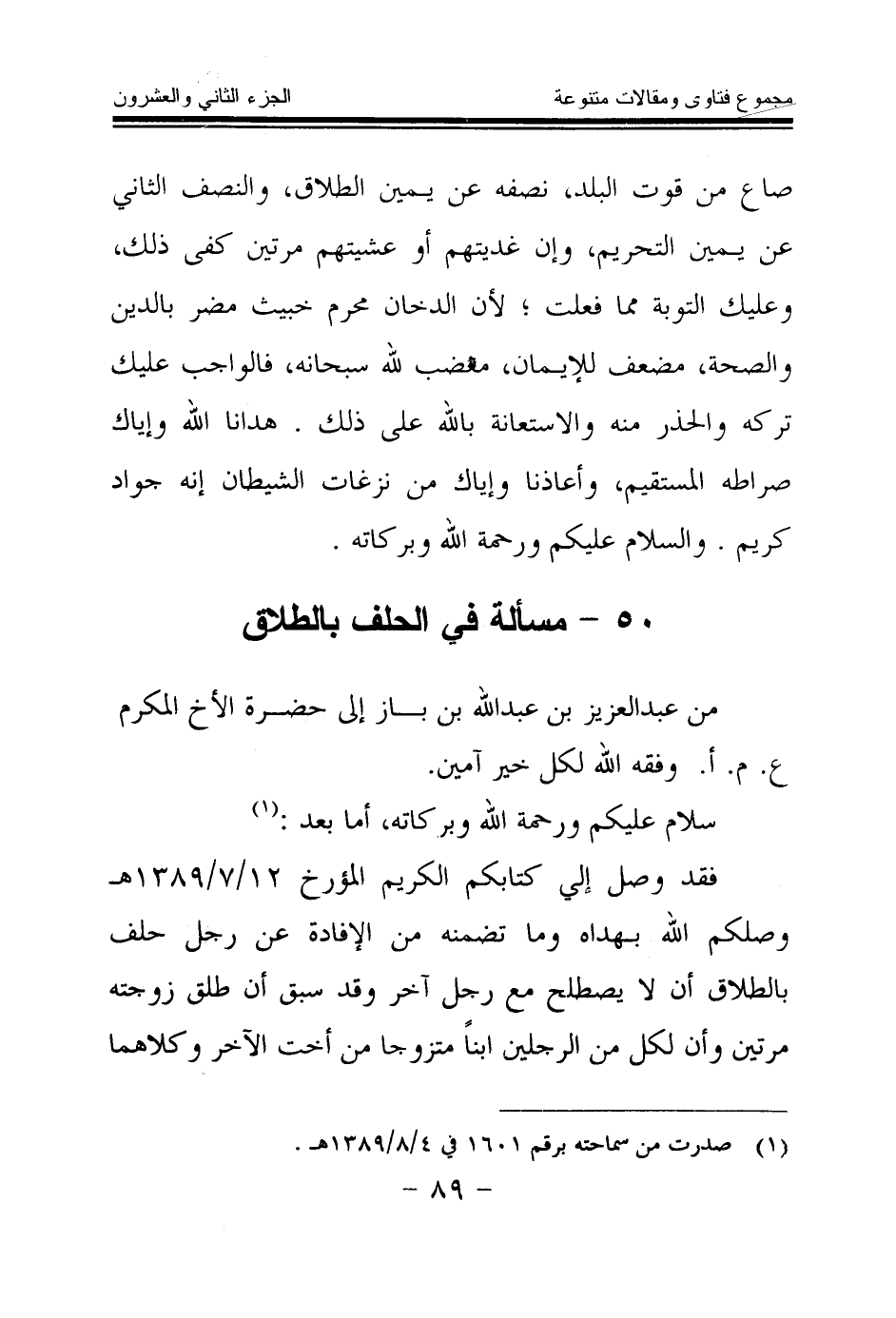 سلام عليكم ورحمة الله وبركاته، أما بعد: (¬1) فقد وصل إلي كتابكم الكريم المؤرخ 12 \ 7 \ 1389هـ وصلكم الله بهداه وما تضمنه من الإفادة عن رجل حلف بالطلاق أن لا يصطلح مع رجل آخر وقد سبق أن طلق زوجته مرتين وأن لكل من الرجلين ابنا متزوجا من أخت الآخر وكلاهما