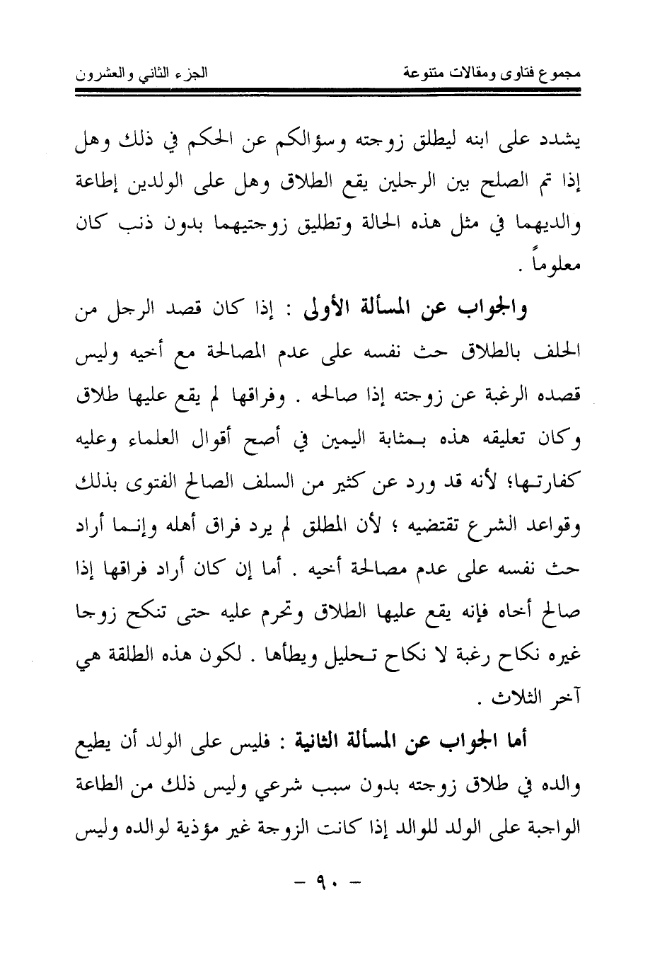 والجواب عن المسألة الأولى: إذا كان قصد الرجل من الحلف بالطلاق حث نفسه على عدم المصالحة مع أخيه وليس قصده الرغبة عن زوجته إذا صالحه. وفراقها لم يقع عليها طلاق وكان تعليقه هذه بمثابة اليمين في أصح أقوال العلماء وعليه كفارتها؛ لأنه قد ورد عن كثير من السلف الصالح الفتوى بذلك وقواعد الشرع تقتضيه؛ لأن المطلق لم يرد فراق أهله وإنما أراد حث نفسه على عدم مصالحة أخيه. أما إن كان أراد فراقها إذا صالح أخاه فإنه يقع عليها الطلاق وتحرم عليه حتى تنكح زوجا غيره نكاح رغبة لا نكاح تحليل ويطأها. لكون هذه الطلقة هي آخر الثلاث.