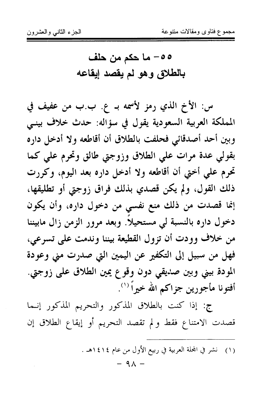 س: الأخ الذي رمز لاسمه ب ع. ب. ب من عفيف في المملكة العربية السعودية يقول في سؤاله: حدث خلاف بيني وبين أحد أصدقائي فحلفت بالطلاق أن أقاطعه ولا أدخل داره بقولي عدة مرات علي الطلاق وزوجتي طالق وتحرم علي كما تحرم علي أختي أن أقاطعه ولا أدخل داره بعد اليوم، وكررت ذلك القول، ولم يكن قصدي بذلك فراق زوجتي أو تطليقها، إنما قصدت من ذلك منع نفسي من دخول داره، وأن يكون دخول داره بالنسبة لي مستحيلا. وبعد مرور الزمن زال ما بيننا من خلاف وودت أن تزول القطيعة بيننا وندمت على تسرعي، فهل من سبيل إلى التكفير عن اليمين التي صدرت مني وعودة المودة بيني وبين صديقي دون وقوع يمين الطلاق على زوجتي. أفتونا مأجورين جزاكم الله خيرا (¬1)