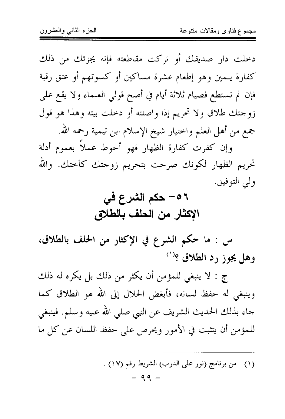 ج: لا ينبغي للمؤمن أن يكثر من ذلك بل يكره له ذلك وينبغي له حفظ لسانه، فـ «أبغض الحلال إلى الله هو الطلاق (¬2) » كما جاء بذلك الحديث الشريف عن النبي صلى الله عليه وسلم. فينبغي للمؤمن أن يتثبت في الأمور ويحرص على حفظ اللسان عن كل ما