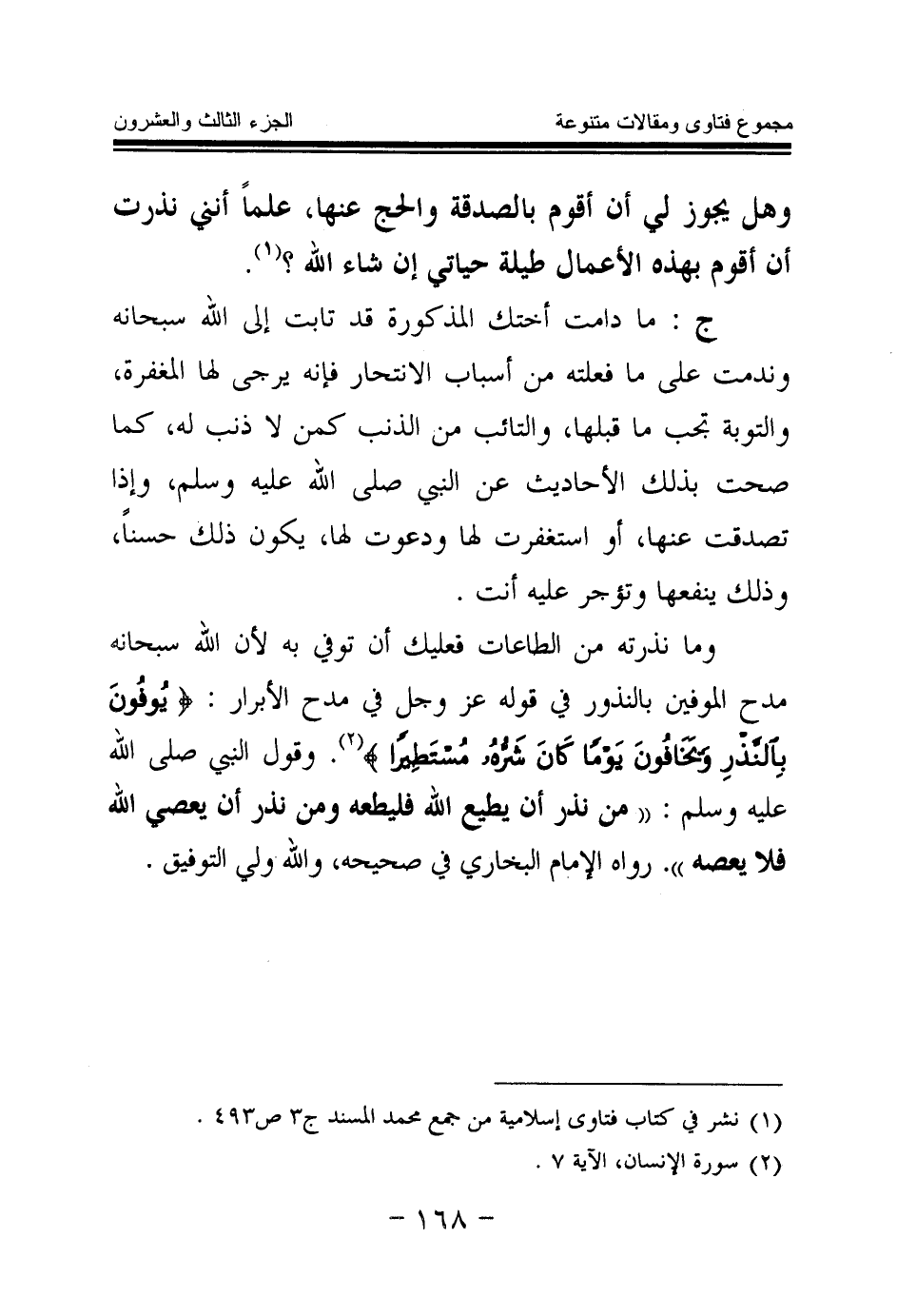 وما نذرته من الطاعات فعليك أن توفي به لأن الله سبحانه مدح الموفين بالنذور في قوله عز وجل في مدح الأبرار: {يُوفُونَ بِالنَّذْرِ وَيَخَافُونَ يَوْمًا كَانَ شَرُّهُ مُسْتَطِيرًا} (¬2) وقول النبي - صلى الله عليه وسلم -: «من نذر أن يطيع الله فليطعه، ومن نذر أن يعصي الله فلا يعصه (¬3) » . رواه الإمام البخاري في صحيحه، والله ولي التوفيق.