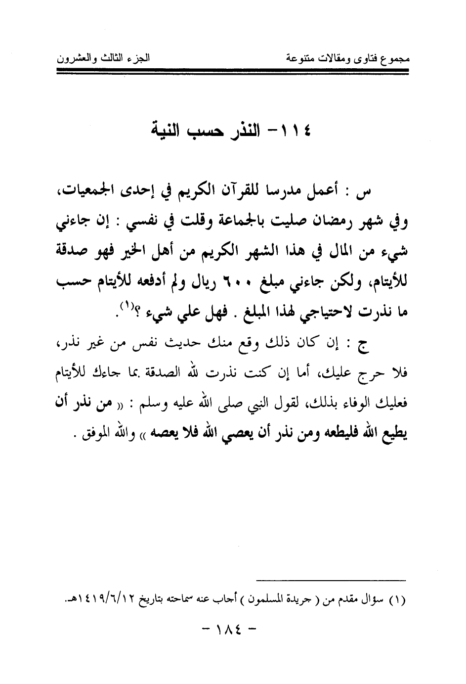 ج: إن كان ذلك وقع منك حديث نفس من غير نذر، فلا حرج عليك، أما إن كنت نذرت لله الصدقة بما جاءك للأيتام فعليك الوفاء بذلك، لقول النبي - صلى الله عليه وسلم -: «من نذر أن يطيع الله فليطعه ومن نذر أن يعصي الله فلا يعصه (¬2) » والله الموفق.