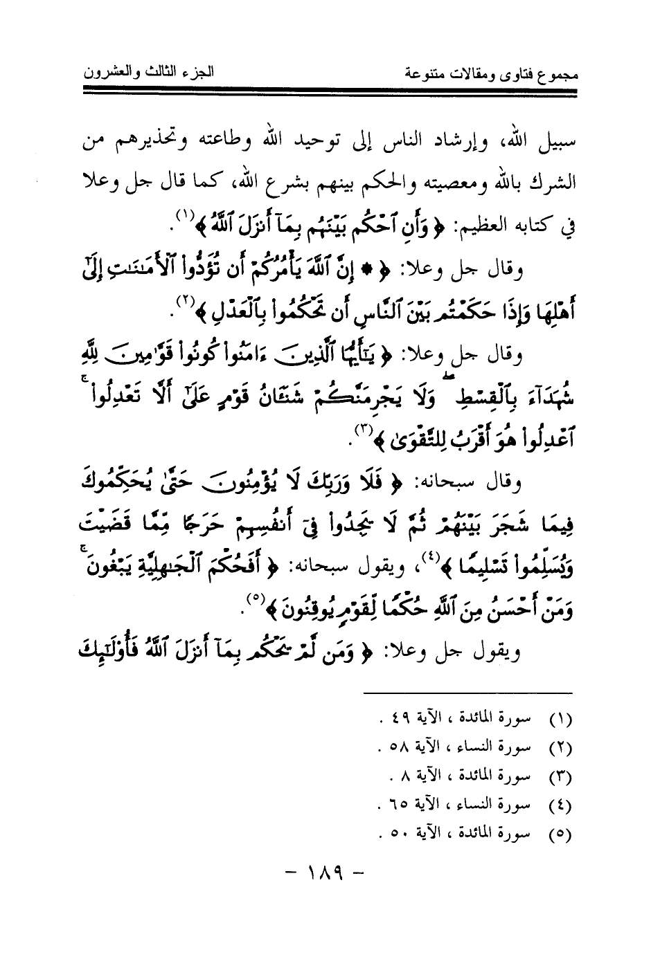 وقال سبحانه: {فَلَا وَرَبِّكَ لَا يُؤْمِنُونَ حَتَّى يُحَكِّمُوكَ فِيمَا شَجَرَ بَيْنَهُمْ ثُمَّ لَا يَجِدُوا فِي أَنْفُسِهِمْ حَرَجًا مِمَّا قَضَيْتَ وَيُسَلِّمُوا تَسْلِيمًا} (¬4) ويقول سبحانه: {أَفَحُكْمَ الْجَاهِلِيَّةِ يَبْغُونَ وَمَنْ أَحْسَنُ مِنَ اللَّهِ حُكْمًا لِقَوْمٍ يُوقِنُونَ} (¬5)