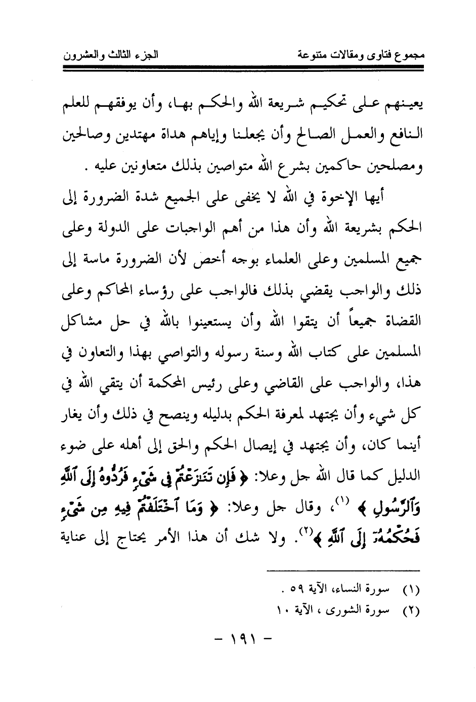 أيها الإخوة في الله لا يخفى على الجميع شدة الضرورة إلى الحكم بشريعة الله وأن هذا من أهم الواجبات على الدولة وعلى جميع المسلمين وعلى العلماء بوجه أخص لأن الضرورة ماسة إلى ذلك والواجب يقضي بذلك فالواجب على رؤساء المحاكم وعلى القضاة جميعا أن يتقوا الله وأن يستعينوا بالله في حل مشاكل المسلمين على كتاب الله وسنة رسوله والتواصي بهذا والتعاون في هذا، والواجب على القاضي وعلى رئيس المحكمة أن يتقي الله في كل شيء وأن يجتهد لمعرفة الحكم بدليله وينصح في ذلك وأن يغار أينما كان، وأن يجتهد في إيصال الحكم والحق إلى أهله على ضوء الدليل كما قال الله جل وعلا: {فَإِنْ تَنَازَعْتُمْ فِي شَيْءٍ فَرُدُّوهُ إِلَى اللَّهِ وَالرَّسُولِ} (¬1) وقال جل وعلا: {وَمَا اخْتَلَفْتُمْ فِيهِ مِنْ شَيْءٍ فَحُكْمُهُ إِلَى اللَّهِ} (¬2) ولا شك أن هذا الأمر يحتاج إلى عناية