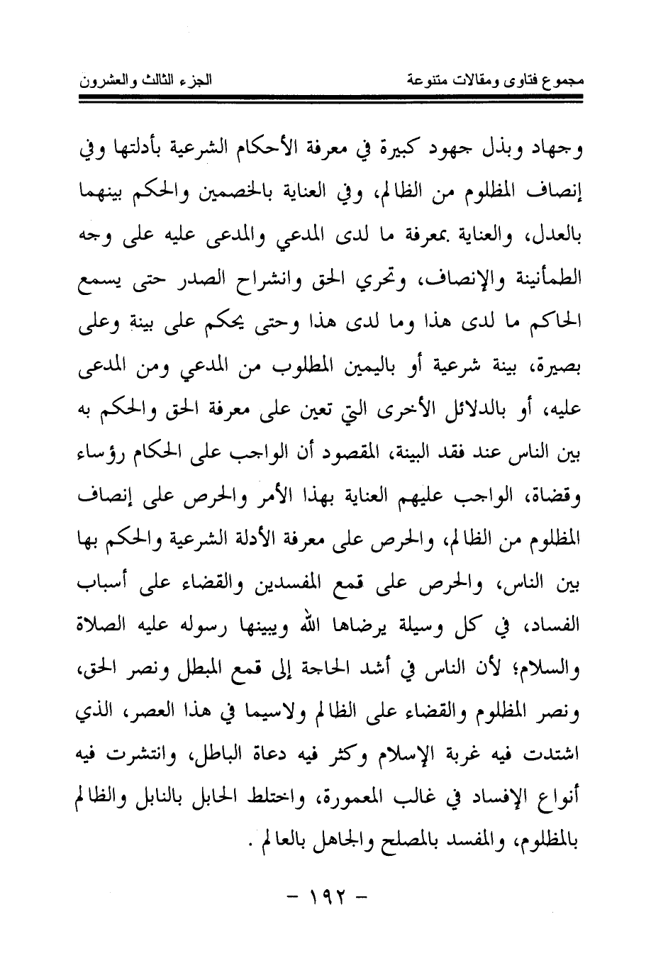 وجهاد وبذل جهود كبيرة في معرفة الأحكام الشرعية بأدلتها وفي إنصاف المظلوم من الظالم، وفي العناية بالخصمين والحكم بينهما بالعدل، والعناية بمعرفة ما لدى المدعي والمدعى عليه على وجه الطمأنينة والإنصاف، وتحري الحق وانشراح الصدر حتى يسمع الحاكم ما لدى هذا وما لدى هذا وحتى يحكم على بينة وعلى بصيرة، بينة شرعية أو باليمين المطلوب من المدعي ومن المدعى عليه، أو بالدلائل الأخرى التي تعين على معرفة الحق والحكم به بين الناس عند فقد البينة، المقصود أن الواجب على الحكام رؤساء وقضاة، الواجب عليهم العناية بهذا الأمر والحرص على إنصاف المظلوم من الظالم، والحرص على معرفة الأدلة الشرعية والحكم بها بين الناس، والحرص على قمع المفسدين والقضاء على أسباب الفساد، في كل وسيلة يرضاها الله ويبينها رسوله عليه الصلاة والسلام؛ لأن الناس في أشد الحاجة إلى قمع المبطل ونصر الحق، ونصر المظلوم والقضاء على الظالم ولا سيما في هذا العصر، الذي اشتدت فيه غربة الإسلام وكثر فيه دعاة الباطل، وانتشرت فيه أنواع الإفساد في غالب المعمورة، واختلط الحابل بالنابل والظالم بالمظلوم، والمفسد بالمصلح والجاهل بالعالم.