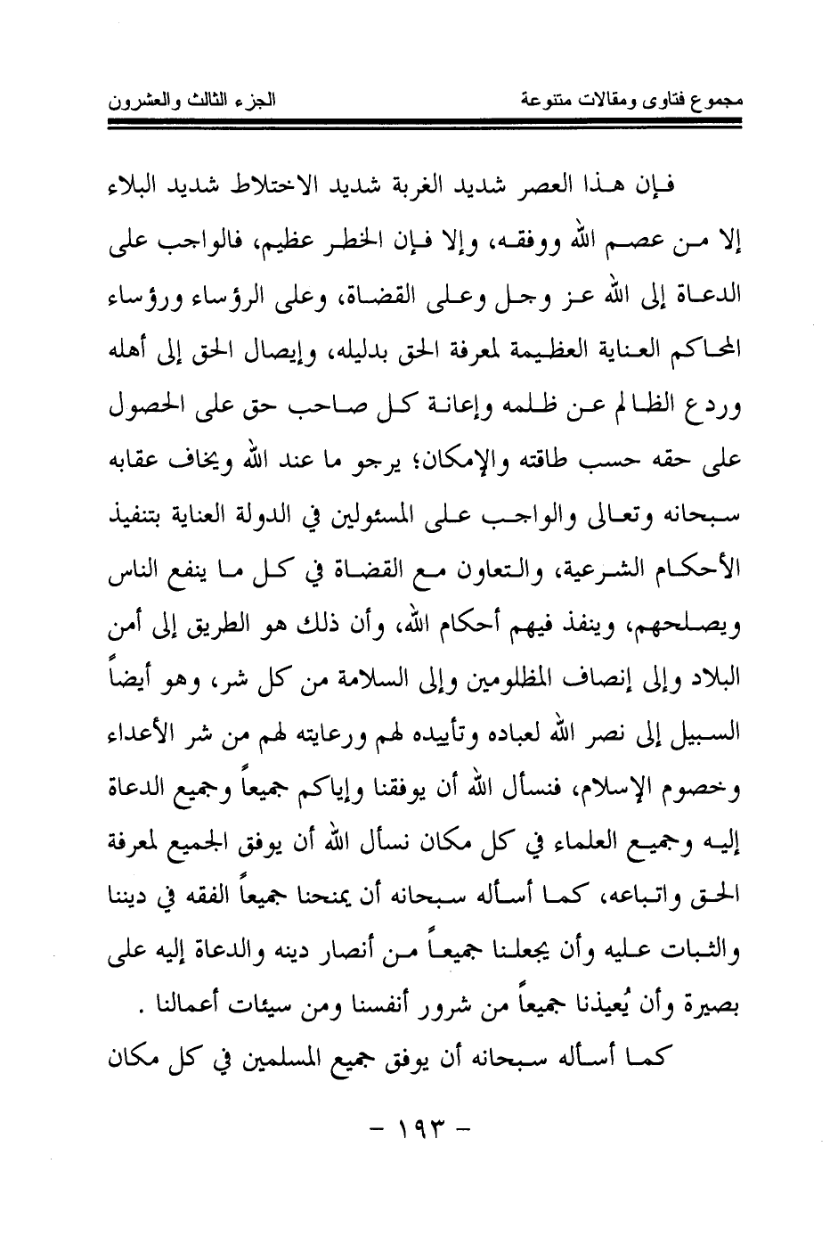 فإن هذا العصر شديد الغربة شديد الاختلاط شديد البلاء إلا من عصم الله ووفقه، وإلا فإن الخطر عظيم، فالواجب على الدعاة إلى الله عز وجل وعلى القضاة، وعلى الرؤساء ورؤساء المحاكم العناية العظيمة لمعرفة الحق بدليله، وإيصال الحق إلى أهله وردع الظالم عن ظلمه وإعانة كل صاحب حق على الحصول على حقه حسب طاقته والإمكان؛ يرجو ما عند الله ويخاف عقابه سبحانه وتعالى والواجب على المسئولين في الدولة العناية بتنفيذ الأحكام الشرعية، والتعاون مع القضاة في كل ما ينفع الناس ويصلحهم، وينفذ فيهم أحكام الله، وأن ذلك هو الطريق إلى أمن البلاد وإلى إنصاف المظلومين وإلى السلامة من كل شر، وهو أيضا السبيل إلى نصر الله لعباده وتأييده لهم ورعايته لهم من شر الأعداء وخصوم الإسلام، فنسأل الله أن يوفقنا وإياكم جميعا وجميع الدعاة إليه وجميع العلماء في كل مكان نسأل الله أن يوفق الجميع لمعرفة الحق واتباعه، كما أسأله سبحانه أن يمنحنا جميعا الفقه في ديننا والثبات عليه وأن يجعلنا جميعا من أنصار دينه والدعاة إليه على بصيرة وأن يعيذنا جميعا من شرور أنفسنا ومن سيئات أعمالنا. كما أسأله سبحانه أن يوفق جميع المسلمين في كل مكان