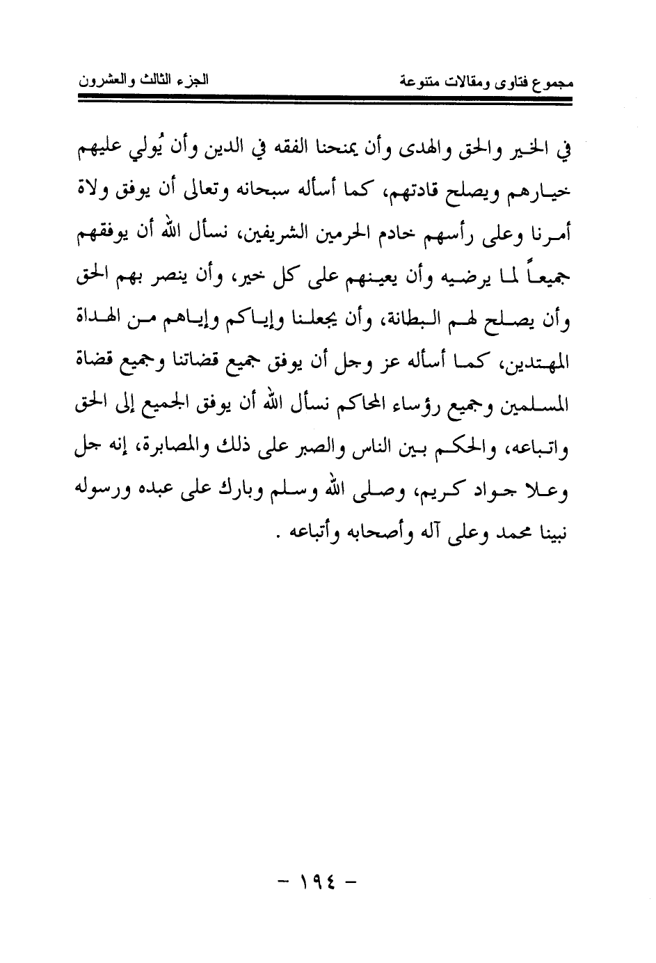في الخير والحق والهدى وأن يمنحنا الفقه في الدين وأن يولي عليهم خيارهم ويصلح قادتهم، كما أسأله سبحانه وتعالى أن يوفق ولاة أمرنا وعلى رأسهم خادم الحرمين الشريفين، نسأل الله أن يوفقهم جميعا لما يرضيه وأن يعينهم على كل خير، وأن ينصر بهم الحق وأن يصلح لهم البطانة، وأن يجعلنا وإياكم وإياهم من الهداة المهتدين، كما أسأله عز وجل أن يوفق جميع قضاتنا وجميع قضاة المسلمين وجميع رؤساء المحاكم نسأل الله أن يوفق الجميع إلى الحق واتباعه، والحكم بين الناس والصبر على ذلك والمصابرة، إنه جل وعلا جواد كريم، وصلى الله وسلم وبارك على عبده ورسوله نبينا محمد وعلى آله وأصحابه وأتباعه.