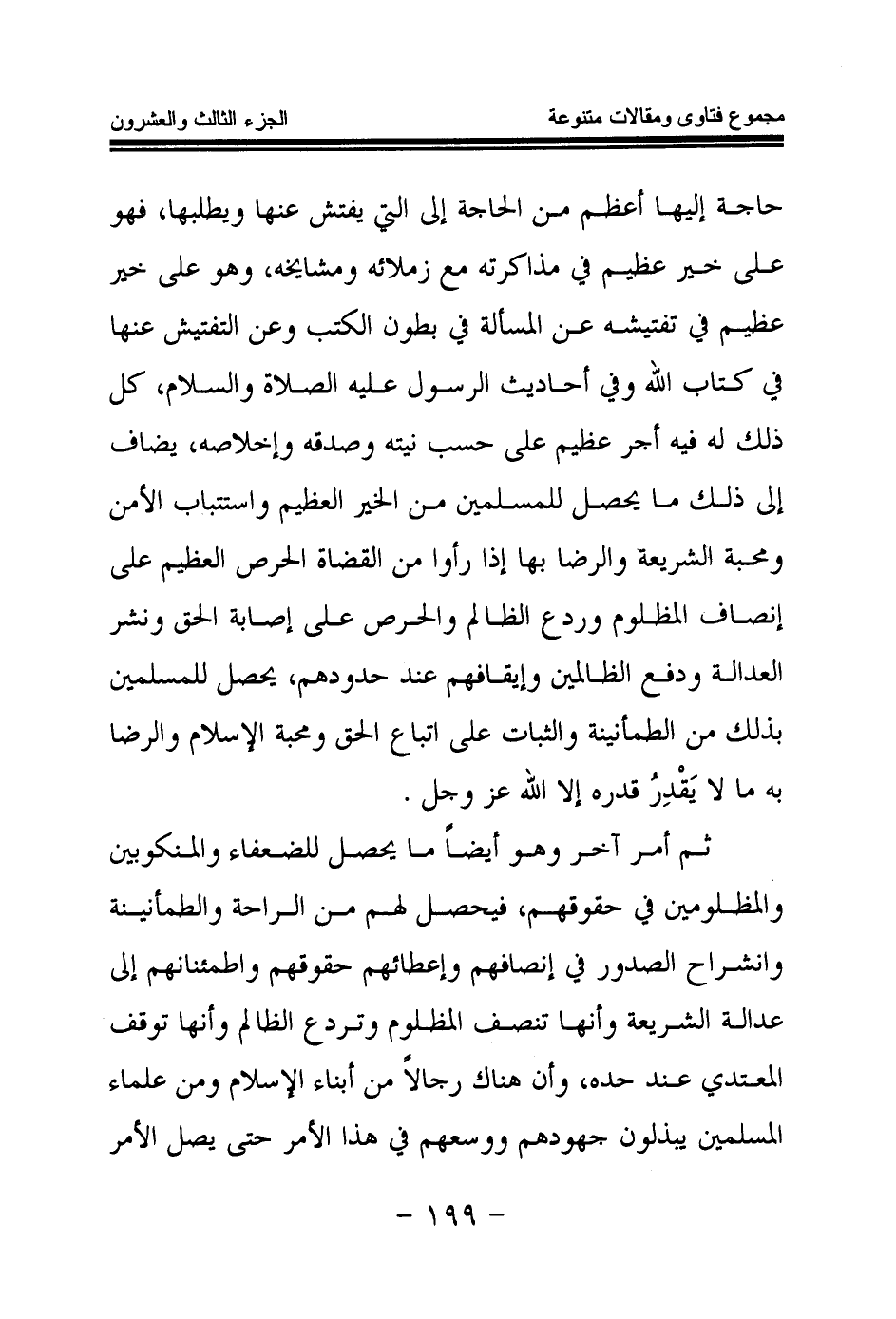 ثم أمر آخر وهو أيضا ما يحصل للضعفاء والمنكوبين والمظلومين في حقوقهم، فيحصل لهم من الراحة والطمأنينة وانشراح الصدور في إنصافهم وإعطائهم حقوقهم واطمئنانهم إلى عدالة الشريعة وأنها تنصف المظلوم وتردع الظالم وأنها توقف المعتدي عند حده، وأن هناك رجالا من أبناء الإسلام ومن علماء المسلمين يبذلون جهودهم ووسعهم في هذا الأمر حتى يصل الأمر