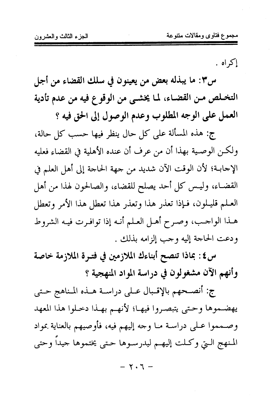 ج: هذه المسألة على كل حال ينظر فيها حسب كل حالة، ولكن الوصية بهذا أن من عرف أن عنده الأهلية في القضاء فعليه الإجابة؛ لأن الوقت الآن شديد من جهة الحاجة إلى أهل العلم في القضاء، وليس كل أحد يصلح للقضاء، والصالحون لهذا من أهل العلم قليلون، فإذا تعذر هذا وتعذر هذا تعطل هذا الأمر وتعطل هذا الواجب، وصرح أهل العلم أنه إذا توافرت فيه الشروط ودعت الحاجة إليه وجب إلزامه بذلك.