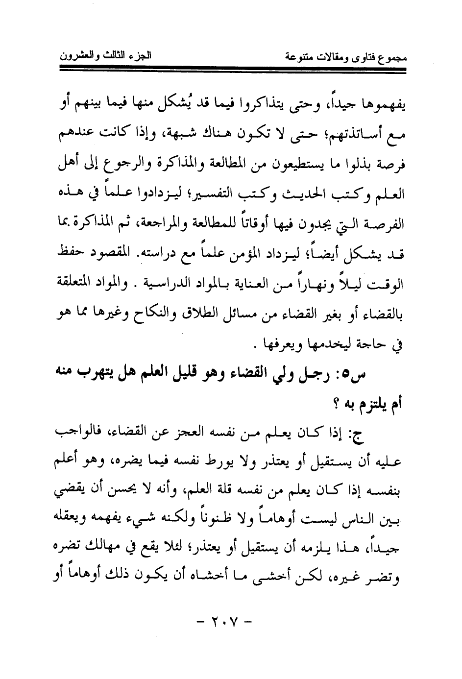 س 5: رجل ولي القضاء وهو قليل العلم هل يتهرب منه أم يلتزم به؟