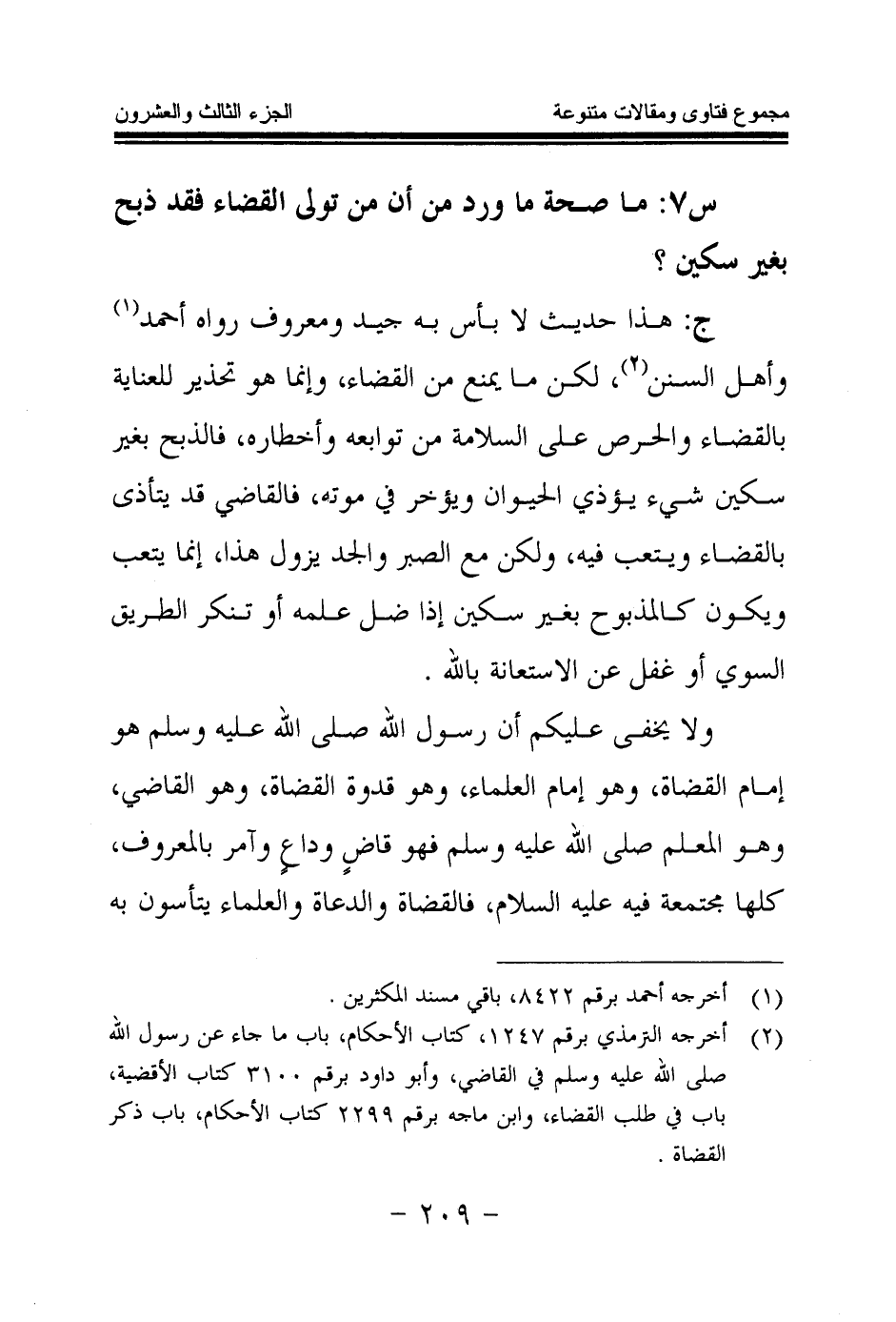 ج: هذا حديث لا بأس به جيد ومعروف رواه أحمد (¬2) . وأهل السنن. لكن ما يمنع من القضاء، وإنما هو تحذير للعناية بالقضاء والحرص على السلامة من توابعه وأخطاره، فالذبح بغير سكين شيء يؤذي الحيوان ويؤخر في موته، فالقاضي قد يتأذى بالقضاء ويتعب فيه، ولكن مع الصبر والجد يزول هذا، إنما يتعب ويكون كالمذبوح بغير سكين إذا ضل علمه أو تنكر الطريق السوي أو غفل عن الاستعانة بالله.