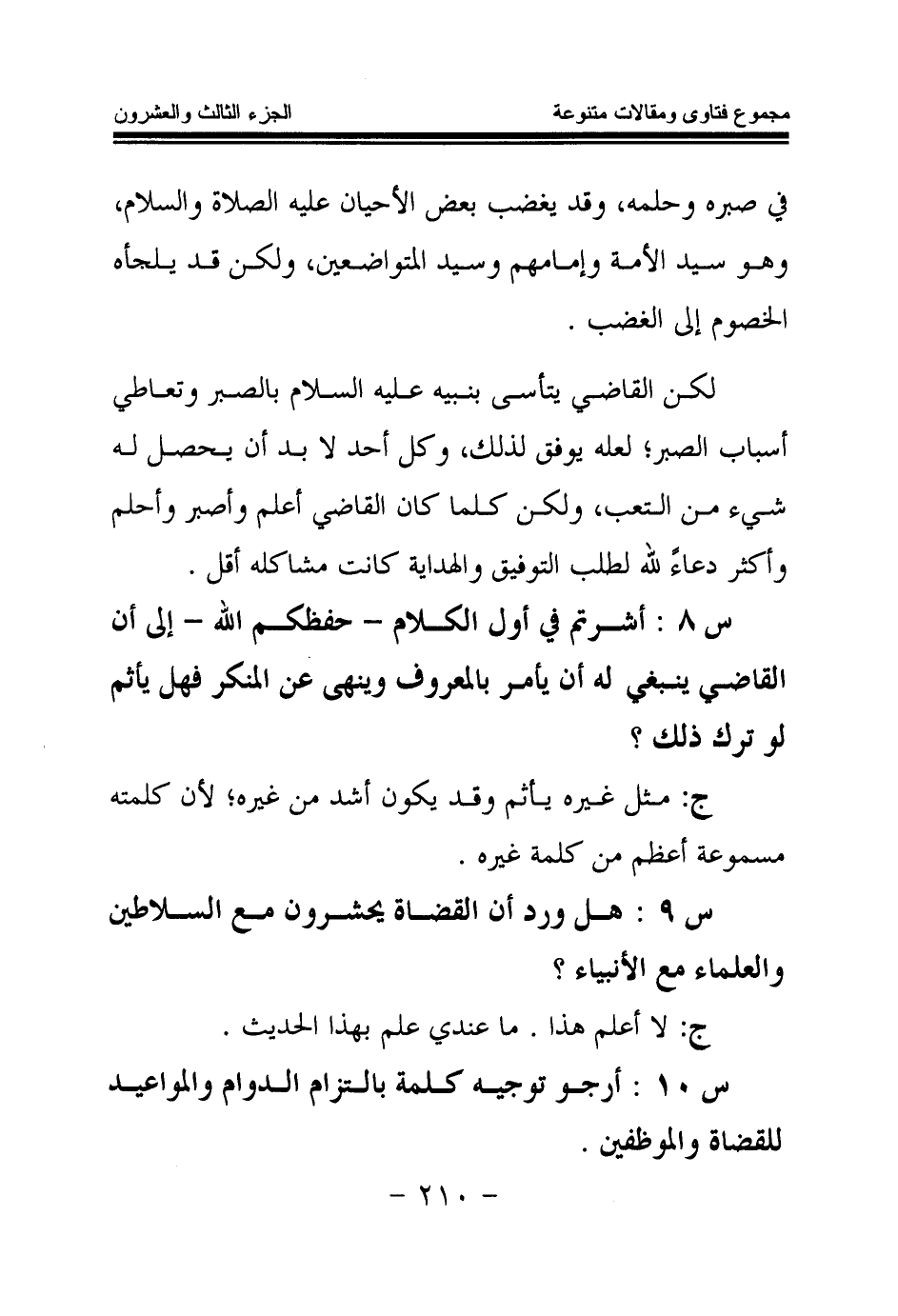 س 8: أشرتم في أول الكلام - حفظكم الله - إلى أن القاضي ينبغي له أن يأمر بالمعروف وينهى عن المنكر فهل يأثم لو ترك ذلك؟