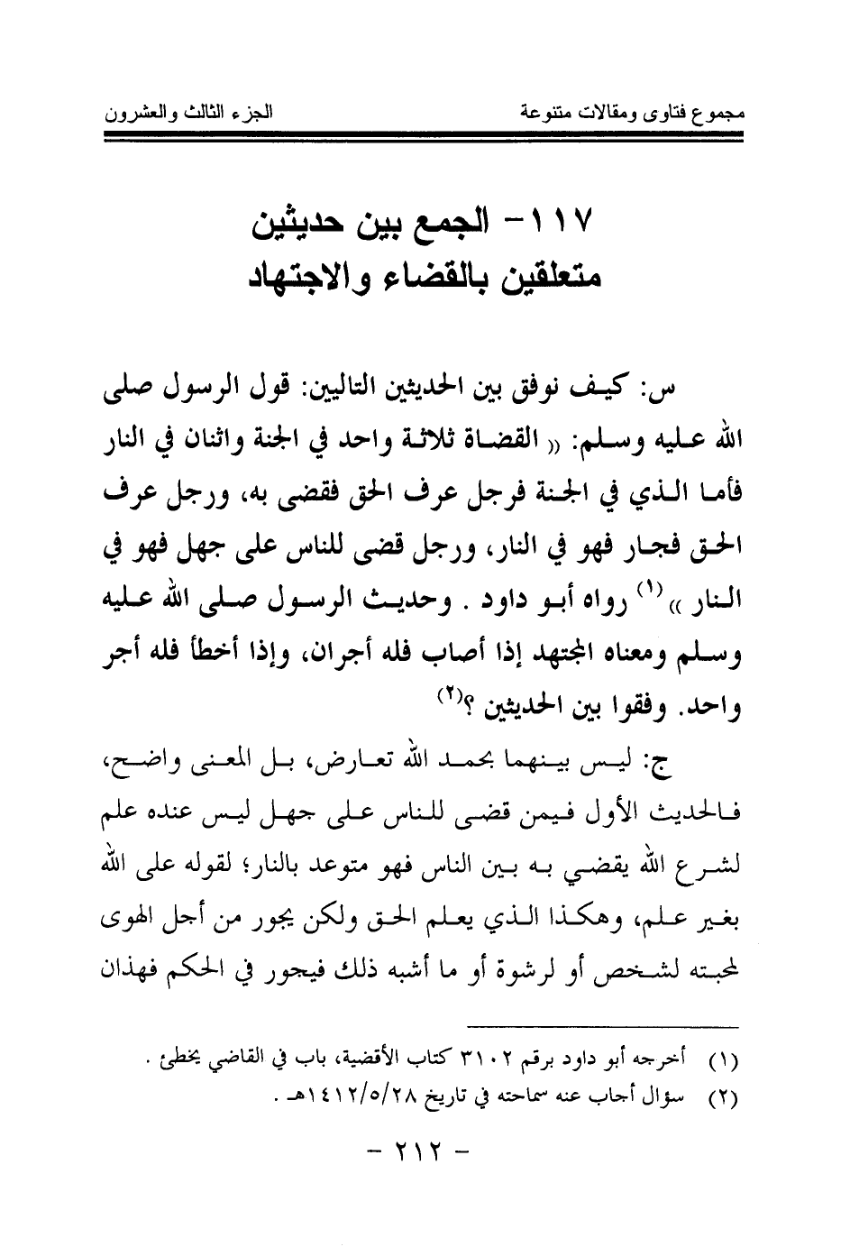 س: كيف نوفق بين الحديثين التاليين: قول الرسول صلى الله عليه وسلم: «القضاة ثلاثة واحد في الجنة واثنان في النار فأما الذي في الجنة فرجل عرف الحق فقضى به، ورجل عرف الحق فجار فهو في النار، ورجل قضى للناس على جهل فهو في النار (¬1) » . رواه أبو داود. وحديث الرسول - صلى الله عليه وسلم - ومعناه المجتهد إذا أصاب فله أجران، وإذا أخطأ فله أجر واحد. وفقوا بين الحديثين؟ (¬2)