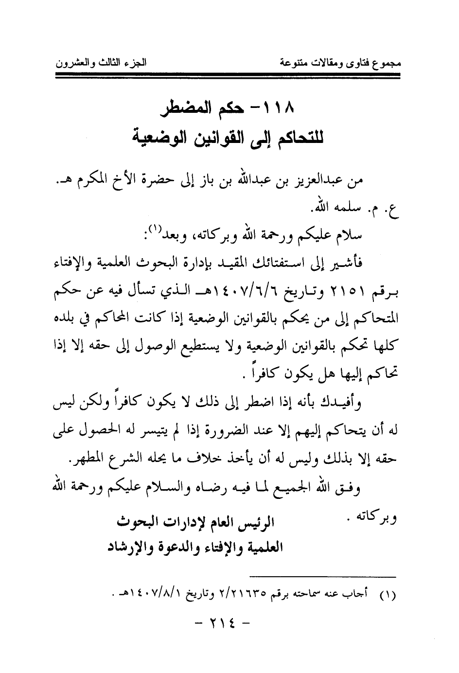 (¬1) أجاب عنه سماحته برقم 21635\2 وتاريخ 1\8\1407 هـ.