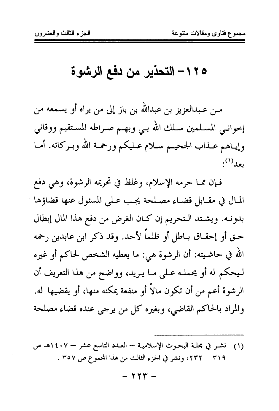 من عبد العزيز بن عبد الله بن باز إلى من يراه أو يسمعه من إخواني المسلمين سلك الله بي وبهم صراطه المستقيم، ووقاني وإياهم عذاب الجحيم، سلام عليكم ورحمة الله وبركاته. أما بعد: