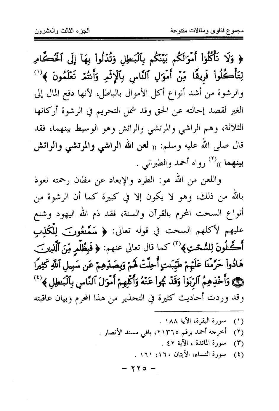 واللعن من الله هو: الطرد والإبعاد عن مظان رحمته، نعوذ بالله من ذلك، وهو لا يكون إلا في كبيرة، كما أن الرشوة من أنواع السحت المحرم بالقرآن والسنة، فقد ذم الله اليهود وشنع عليهم لأكلهم السحت في قوله تعالى: {سَمَّاعُونَ لِلْكَذِبِ أَكَّالُونَ لِلسُّحْتِ} (¬3) كما قال تعالى عنهم: {فَبِظُلْمٍ مِنَ الَّذِينَ هَادُوا حَرَّمْنَا عَلَيْهِمْ طَيِّبَاتٍ أُحِلَّتْ لَهُمْ وَبِصَدِّهِمْ عَنْ سَبِيلِ اللَّهِ كَثِيرًا} (¬4) {وَأَخْذِهِمُ الرِّبَا وَقَدْ نُهُوا عَنْهُ وَأَكْلِهِمْ أَمْوَالَ النَّاسِ بِالْبَاطِلِ} (¬5)