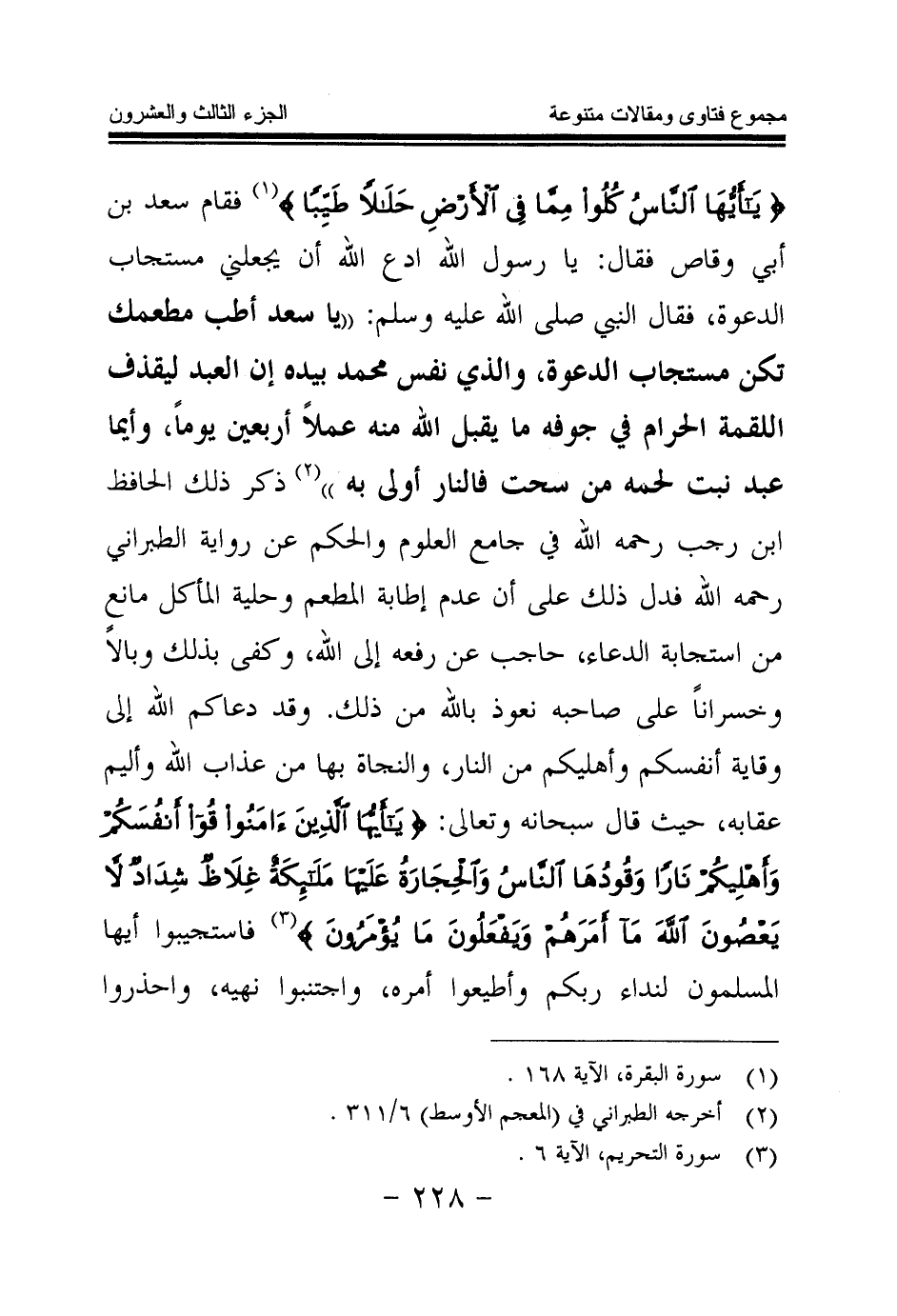 فقام سعد بن أبي وقاص فقال: يا رسول الله ادع الله أن يجعلني مستجاب الدعوة، فقال النبي صلى الله عليه وسلم: يا سعد أطب مطعمك تكن مستجاب الدعوة، والذي نفس محمد بيده إن العبد ليقذف اللقمة الحرام في جوفه ما يقبل الله منه عملا أربعين يوما، وأيما عبد نبت لحمه من سحت فالنار أولى به (¬2) » .