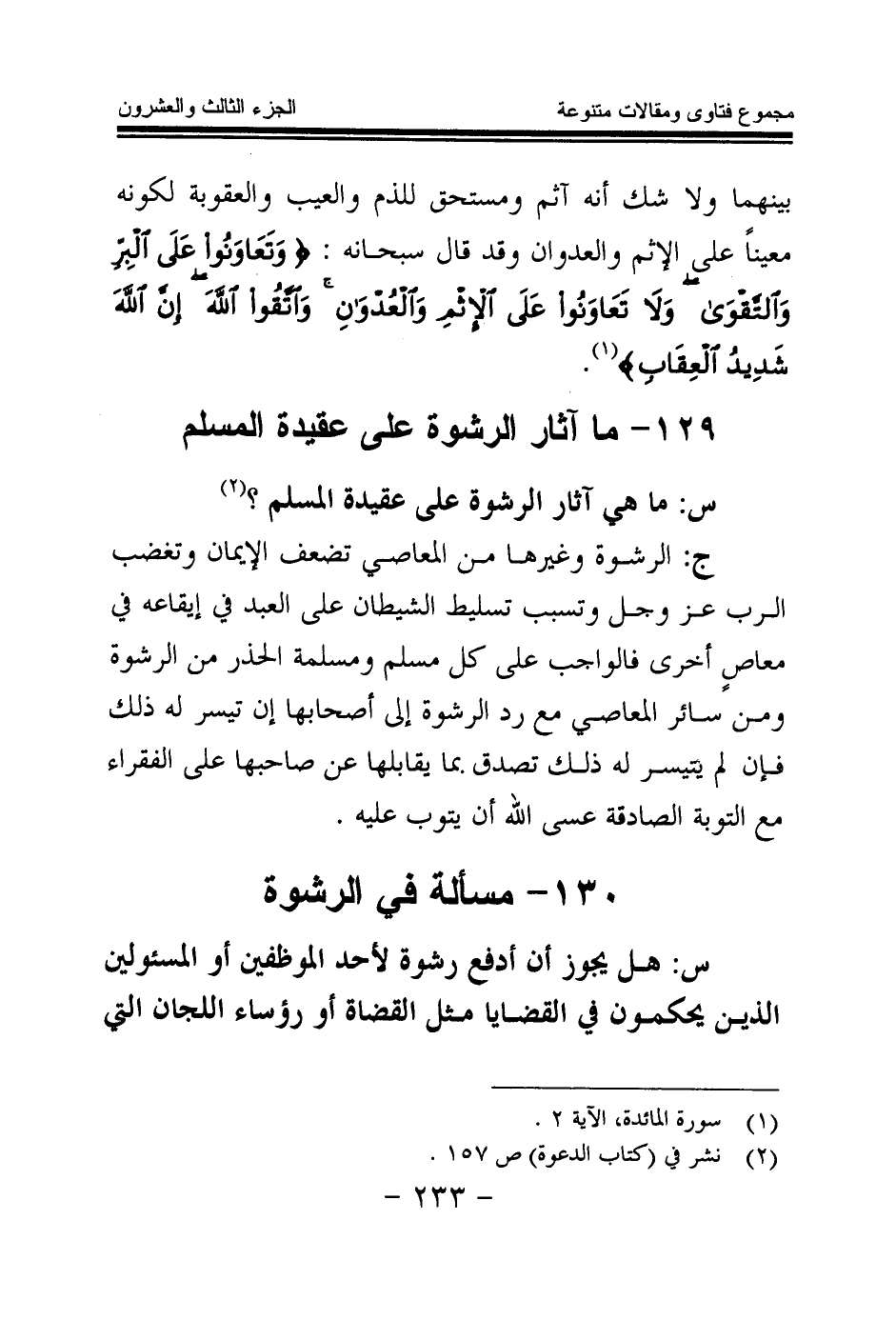 س: ما هي آثار الرشوة على عقيدة المسلم؟ (¬1)