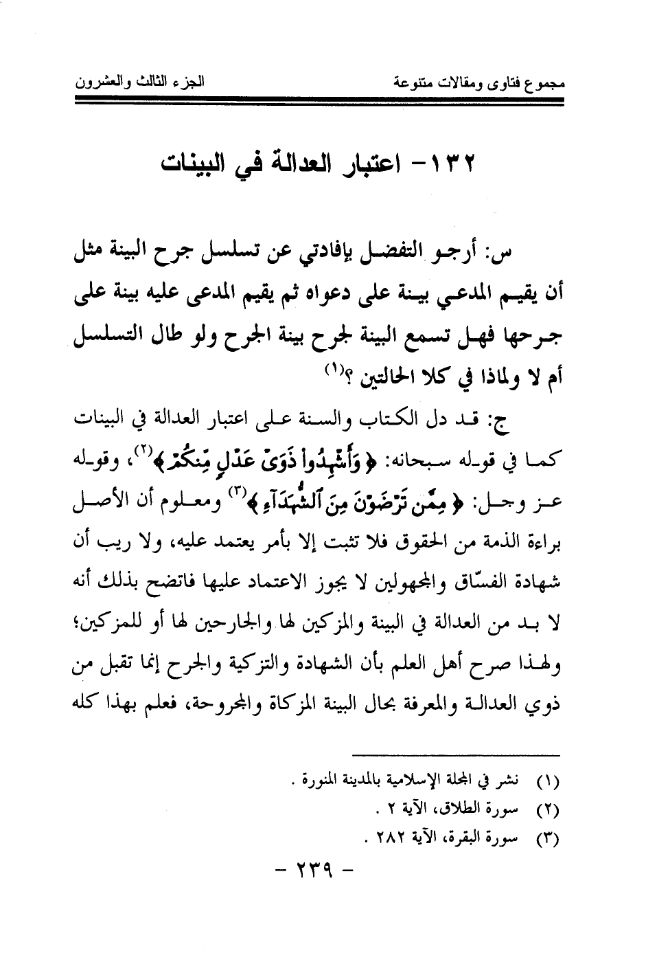 ج: قد دل الكتاب والسنة على اعتبار العدالة في البينات كما في قوله سبحانه: {وَأَشْهِدُوا ذَوَيْ عَدْلٍ مِنْكُمْ} (¬2) وقوله عز وجل: {مِمَّنْ تَرْضَوْنَ مِنَ الشُّهَدَاءِ} (¬3) ومعلوم أن الأصل براءة الذمة من الحقوق فلا تثبت إلا بأمر يعتمد عليه، ولا ريب أن شهادة الفساق والمجهولين لا يجوز الاعتماد عليها فاتضح بذلك أنه لا بد من العدالة في البينة والمزكين لها والجارحين لها أو للمزكين؛ ولهذا صرح أهل العلم بأن الشهادة والتزكية والجرح إنما تقبل من ذوي العدالة والمعرفة بحال البينة المزكاة والمجروحة، فعلم بهذا كله