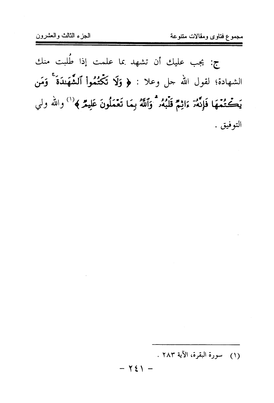 ج: يجب عليك أن تشهد بما علمت إذا طلبت منك الشهادة؛ لقول الله جل وعلا: {وَلَا تَكْتُمُوا الشَّهَادَةَ وَمَنْ يَكْتُمْهَا فَإِنَّهُ آثِمٌ قَلْبُهُ وَاللَّهُ بِمَا تَعْمَلُونَ عَلِيمٌ} (¬1) والله ولي التوفيق.