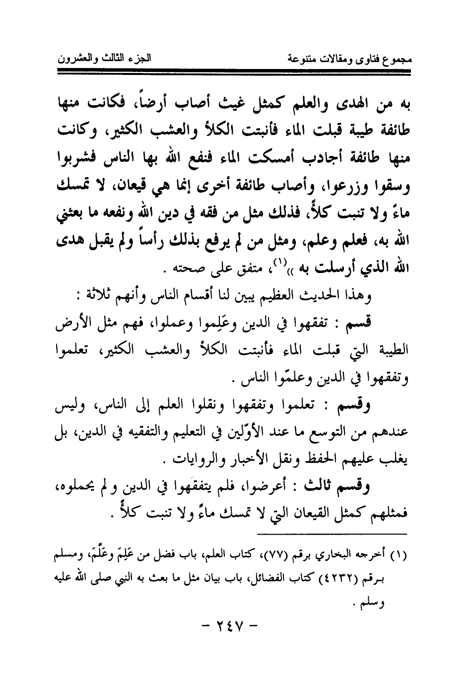 به من الهدى والعلم كمثل غيث أصاب أرضا، فكانت منها طائفة طيبة قبلت الماء فأنبتت الكلأ والعشب الكثير، وكانت منها طائفة أجادب أمسكت الماء فنفع الله بها الناس فشربوا وسقوا وزرعوا، وأصاب طائفة أخرى إنما هي قيعان، لا تمسك ماء ولا تنبت كلأ، فذلك مثل من فقه في دين الله ونفعه ما بعثني الله به، فعلم وعلم، ومثل من لم يرفع بذلك رأسا ولم يقبل هدى الله الذي أرسلت به (¬1) » . متفق على صحته.