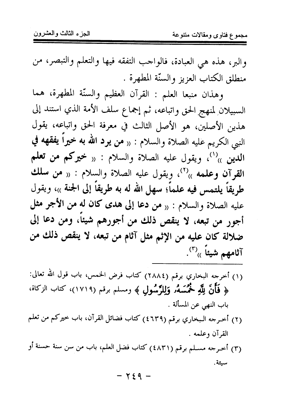 وهذان منبعا العلم: القرآن العظيم والسنة المطهرة، هما السبيلان لمنهج الحق واتباعه، ثم إجماع سلف الأمة الذي استند إلى هذين الأصلين، هو الأصل الثالث في معرفة الحق واتباعه، يقول النبي الكريم عليه الصلاة والسلام: «من يرد الله به خيرا يفقهه في الدين (¬1) » . ويقول عليه الصلاة والسلام: «خيركم من تعلم القرآن وعلمه (¬2) » . ويقول عليه الصلاة والسلام: «من سلك طريقا يلتمس فيه علما؛ سهل الله له به طريقا إلى الجنة (¬3) » ، ويقول عليه الصلاة والسلام: «من دعا إلى هدى كان له من الأجر مثل أجور من تبعه، لا ينقص ذلك من أجورهم شيئا، ومن دعا إلى ضلالة كان عليه من الإثم مثل آثام من تبعه، لا ينقص ذلك من آثامهم شيئا (¬4) » .