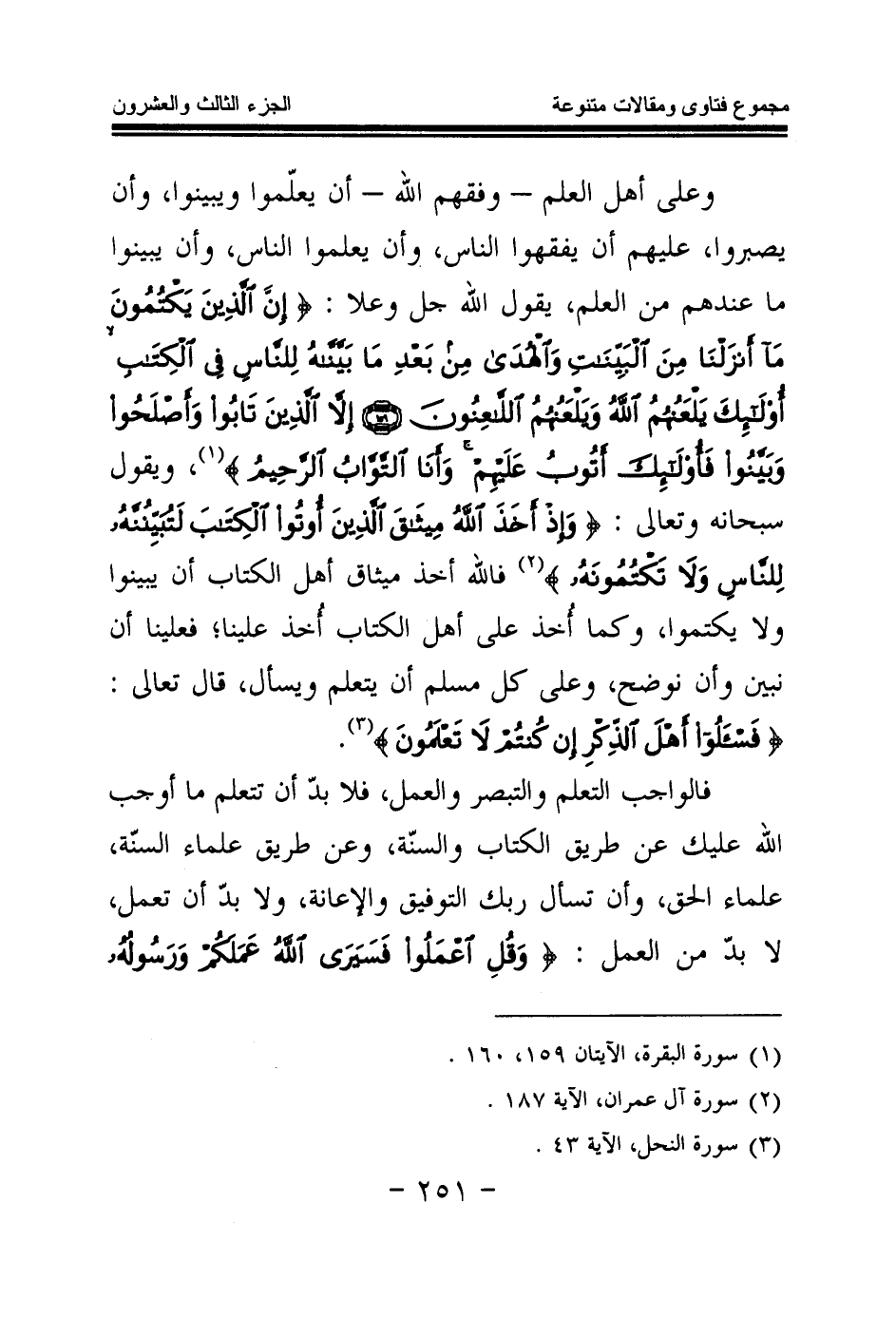 وعلى أهل العلم - وفقهم الله - أن يعلموا ويبينوا، وأن يصبروا، عليهم أن يفقهوا الناس، وأن يعلموا الناس، وأن يبينوا ما عندهم من العلم، يقول الله جل وعلا: {إِنَّ الَّذِينَ يَكْتُمُونَ مَا أَنْزَلْنَا مِنَ الْبَيِّنَاتِ وَالْهُدَى مِنْ بَعْدِ مَا بَيَّنَّاهُ لِلنَّاسِ فِي الْكِتَابِ أُولَئِكَ يَلْعَنُهُمُ اللَّهُ وَيَلْعَنُهُمُ اللَّاعِنُونَ} (¬1) {إِلَّا الَّذِينَ تَابُوا وَأَصْلَحُوا وَبَيَّنُوا فَأُولَئِكَ أَتُوبُ عَلَيْهِمْ وَأَنَا التَّوَّابُ الرَّحِيمُ} (¬2) ويقول سبحانه وتعالى: {وَإِذْ أَخَذَ اللَّهُ مِيثَاقَ الَّذِينَ أُوتُوا الْكِتَابَ لَتُبَيِّنُنَّهُ لِلنَّاسِ وَلَا تَكْتُمُونَهُ} (¬3) فالله أخذ ميثاق أهل الكتاب أن يبينوا ولا يكتموا، وكما أخذ على أهل الكتاب أخذ علينا؛ فعلينا أن نبين وأن نوضح، وعلى كل مسلم أن يتعلم ويسأل، قال تعالى: {فَاسْأَلُوا أَهْلَ الذِّكْرِ إِنْ كُنْتُمْ لَا تَعْلَمُونَ} (¬4)