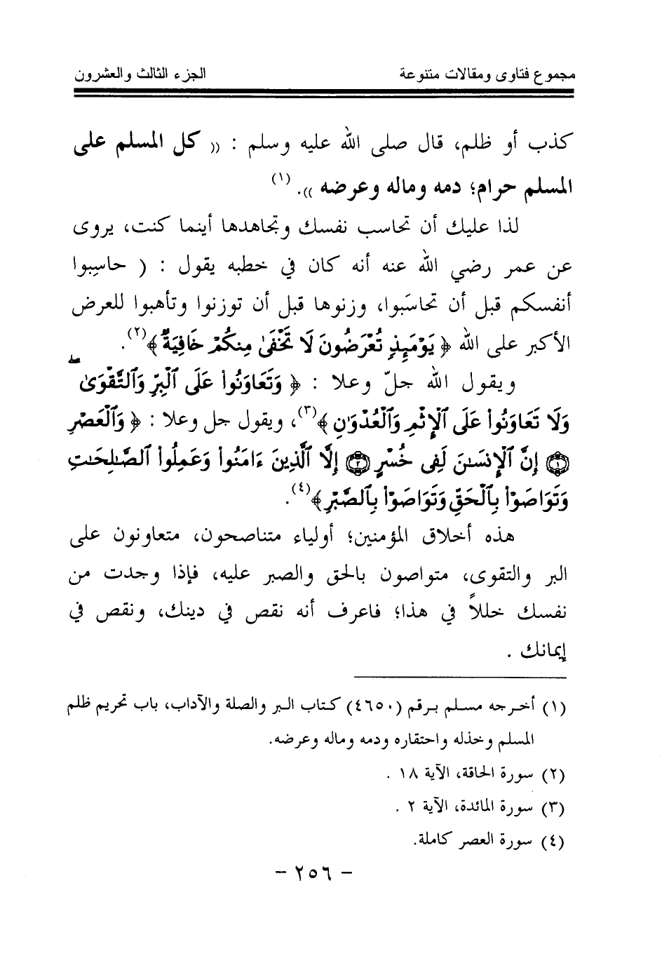 ويقول الله جل وعلا: {وَتَعَاوَنُوا عَلَى الْبِرِّ وَالتَّقْوَى وَلَا تَعَاوَنُوا عَلَى الْإِثْمِ وَالْعُدْوَانِ} (¬3) ويقول جل وعلا: {وَالْعَصْرِ} (¬4) {إِنَّ الْإِنْسَانَ لَفِي خُسْرٍ} (¬5) {إِلَّا الَّذِينَ آمَنُوا وَعَمِلُوا الصَّالِحَاتِ وَتَوَاصَوْا بِالْحَقِّ وَتَوَاصَوْا بِالصَّبْرِ} (¬6)